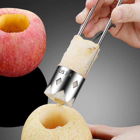 Эффективное удаление сердцевины фруктов: Этот инструмент для определения фруктов, оснащенный зазубренными лезвиями из нержавеющей стали, легко и точно удаляет сердцевину из различных фруктов и овощей, таких как яблоки, груши, горькая тыква и красный болгарский перец.