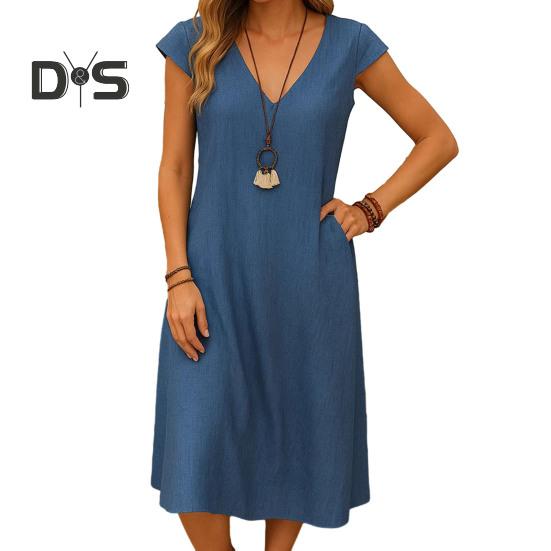 Женское летнее хлопковое льняное платье миди с V-образным вырезом, короткими рукавами и карманами, повседневный пляжный сарафан А-силуэта