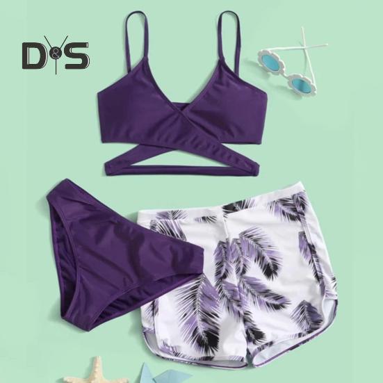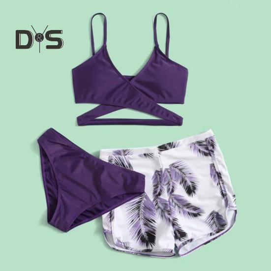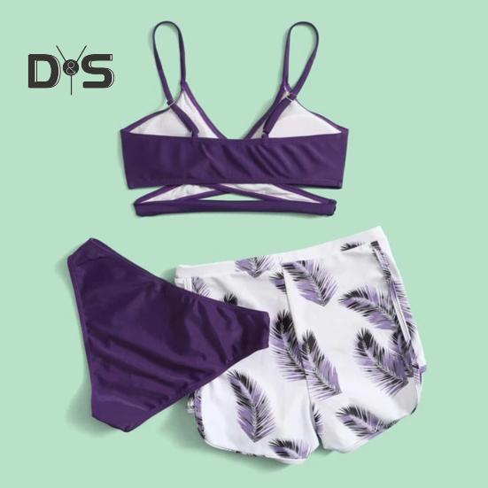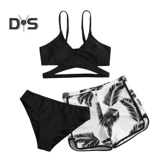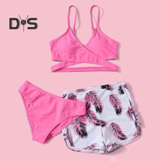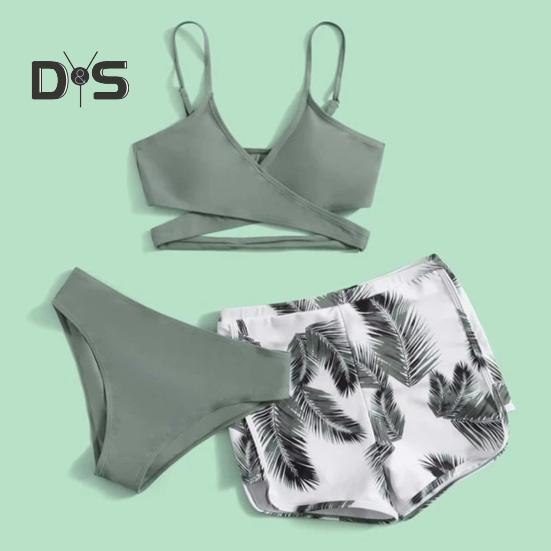 Комплект из 3 предметов: купальник с V-образным вырезом, бюстгальтер со средней посадкой, плавки, однотонный комплект бикини с шортами с принтом перьев