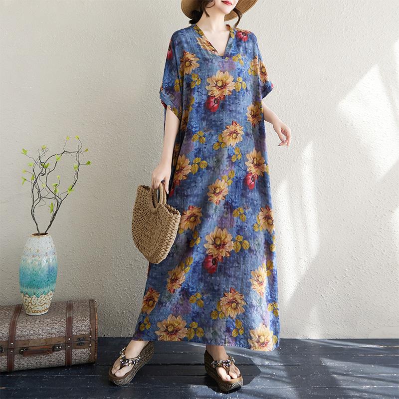 DIMANAF 2025 Лето Большой Размер Новое Платье Пляжное Базовое Свободное Женское Повседневное Платье с Цветочным Принтом V-образный Вырез Длинное Винтажное Платье Макси — купить товар онлайн с бесплатной доставкой по всему миру!