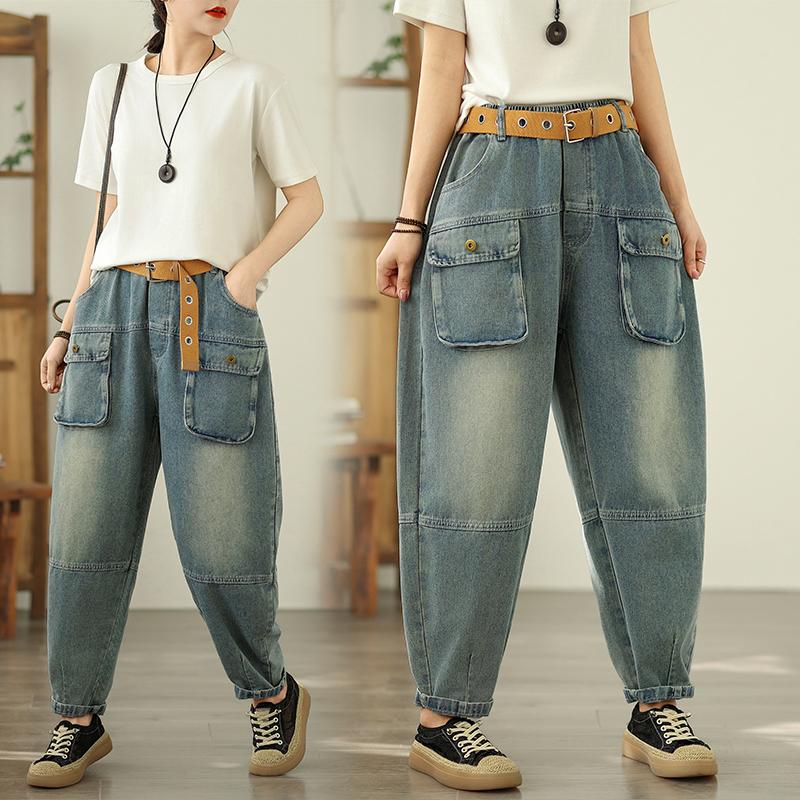 DIMANAF Большой размер 2025 Женские джинсы Летние брюки Высокая талия Свободные Карманы Эластичные Базовые Брюки-шаровары Макси