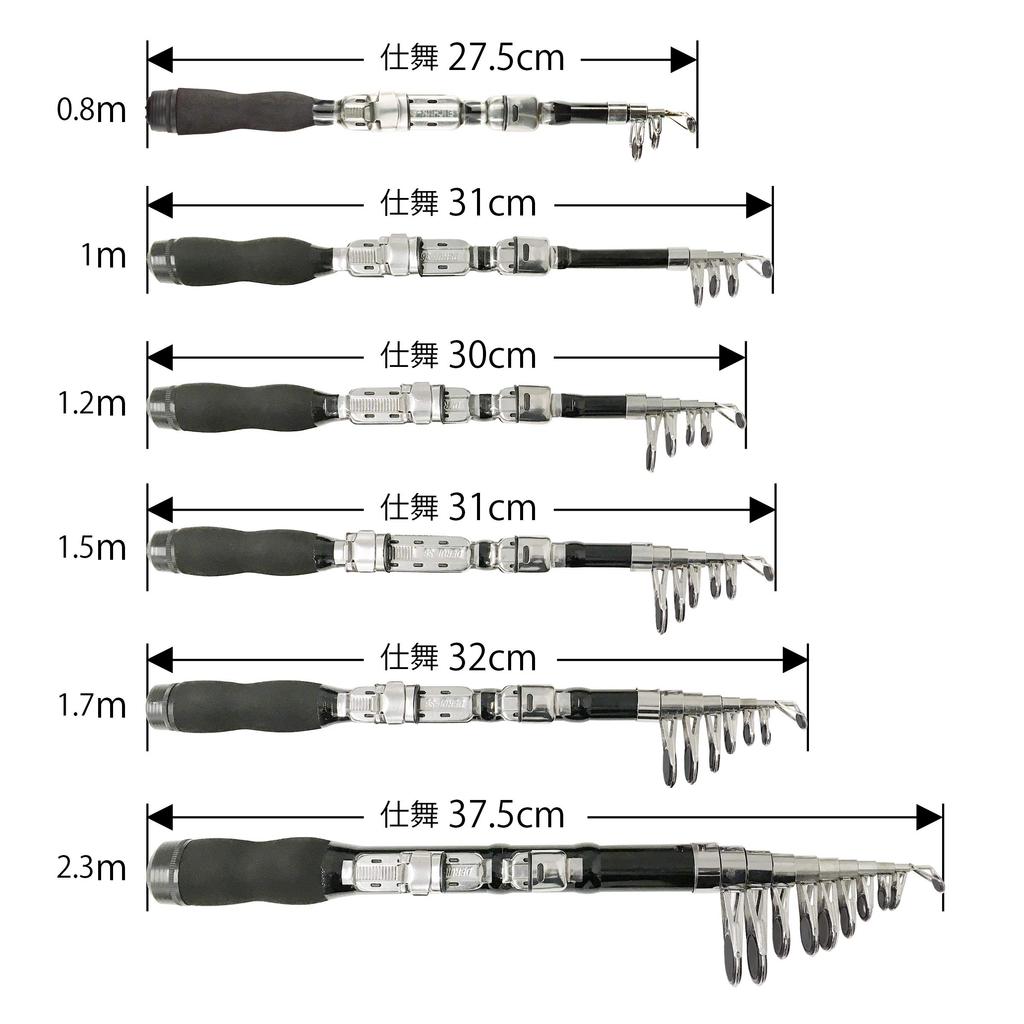 ·Общая длина: 0,8-2,3 м ・Падение: 27,5-37,5 см ・Вес: 62-197 г ・Диаметр кончика: 2,4-2,5 мм ・Оригинальный диаметр: 23-31 мм ・Количество соединений: 4-11 ・Количество направляющих: 3-10