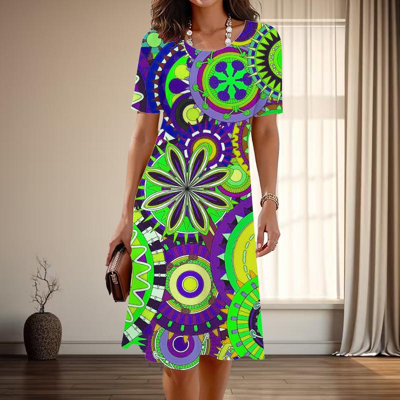Женская мода изящный ретро узор принт лето весна короткий рукав О-образный вырез повседневные платья