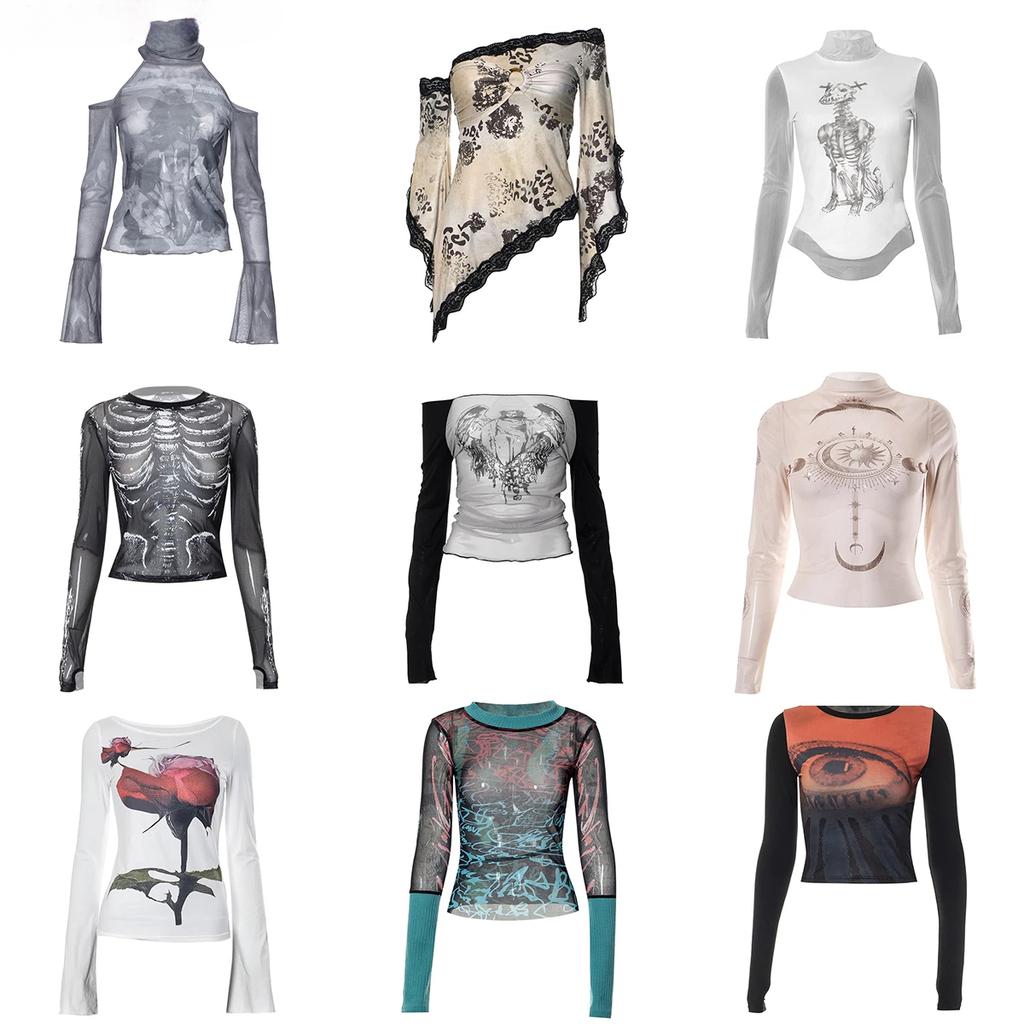 Y2K сексуальные кружевные сетчатые прозрачные футболки с готическим принтом с длинным рукавом трикотажные топы в стиле пэчворк винтажные женские летние уличные модели — купить товар онлайн с бесплатной доставкой по всему миру!
