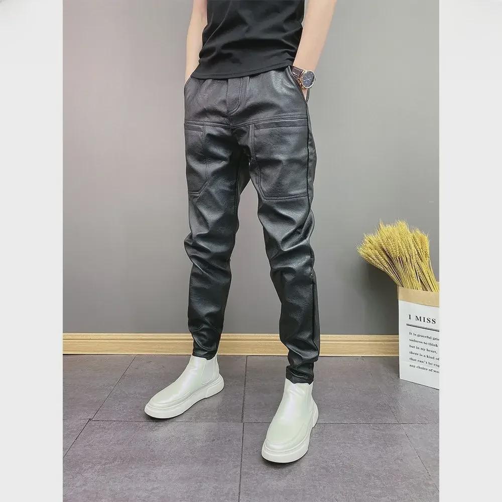 Мужские модные эластичные брюки из искусственной кожи — ветрозащитные, водонепроницаемые, повседневные брюки с шестью карманами для осени/зимы