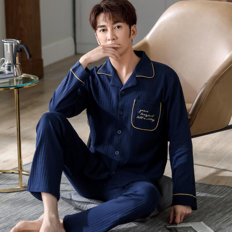 Мужская пижама из цельного хлопка, весенний костюм с длинным рукавом и принтом, осенняя ночная рубашка с воротником, мужская пижама из двух частей, размер L-4XL