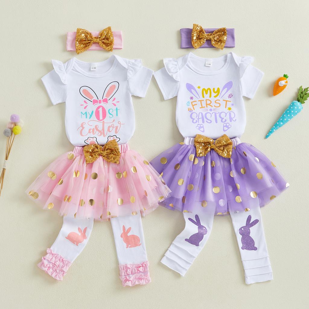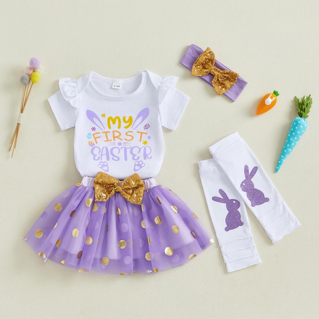 Детский пасхальный наряд для девочки, комбинезон с длинными рукавами и зайчиком, юбка в золотой горошек из тюля, повязка на голову с бантом, гетры, весенний комплект