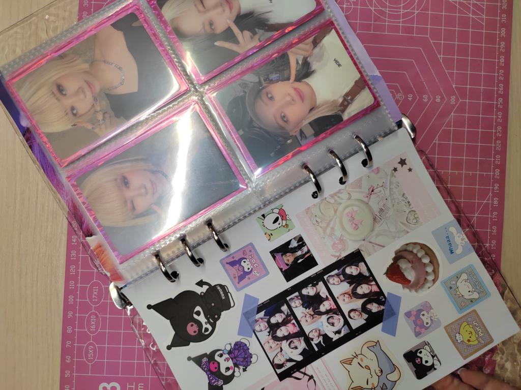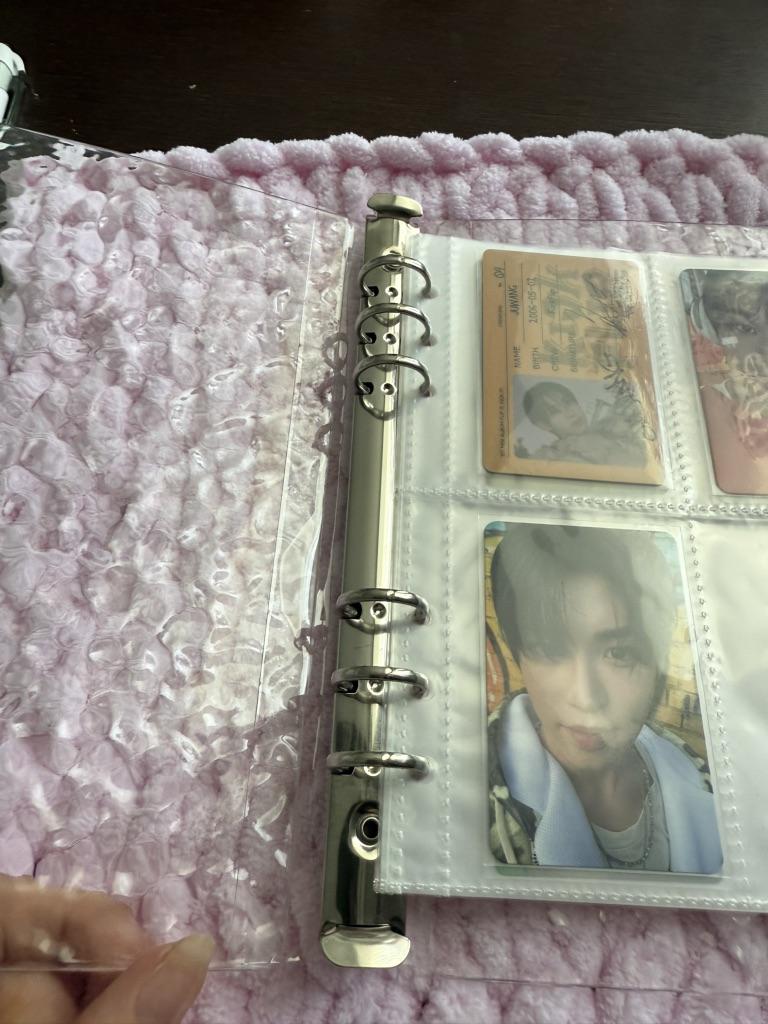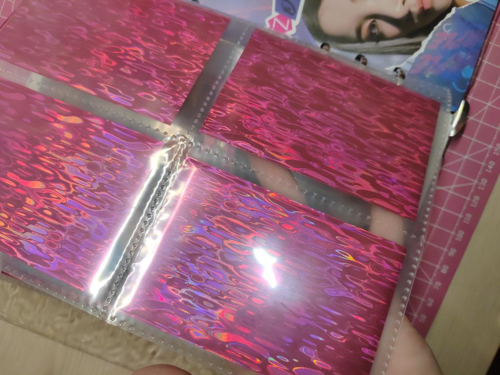 биндер сам по себе хороший, спасибо, что положили листы, но они мутные и забирают цвет карты, для примера взяла листы из другого биндера, также на железном креплении не пластик , а силикон, немного обидно, а так все хорошо