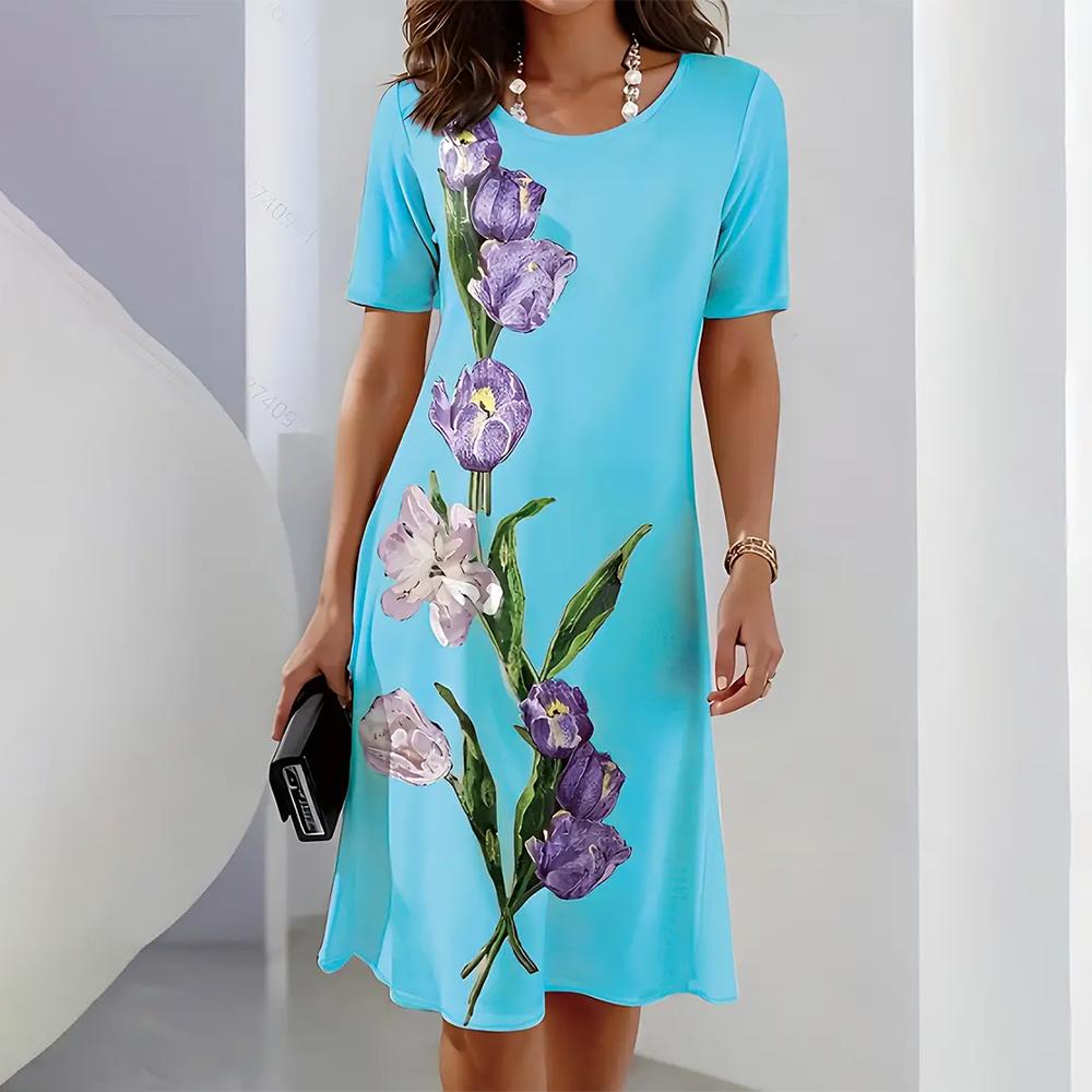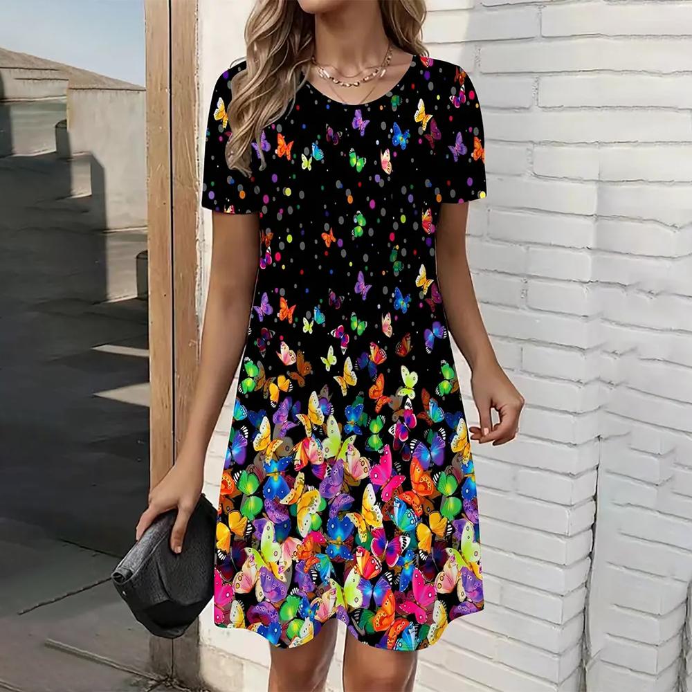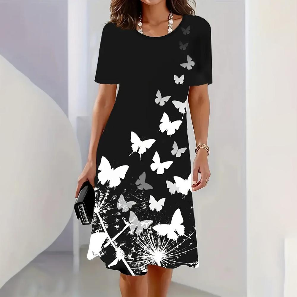 Элегантное новое женское платье с коротким рукавом и средней длиной, с принтом 3D-бабочки, с круглым вырезом, платья свободного покроя, женская одежда 2025 года на лето