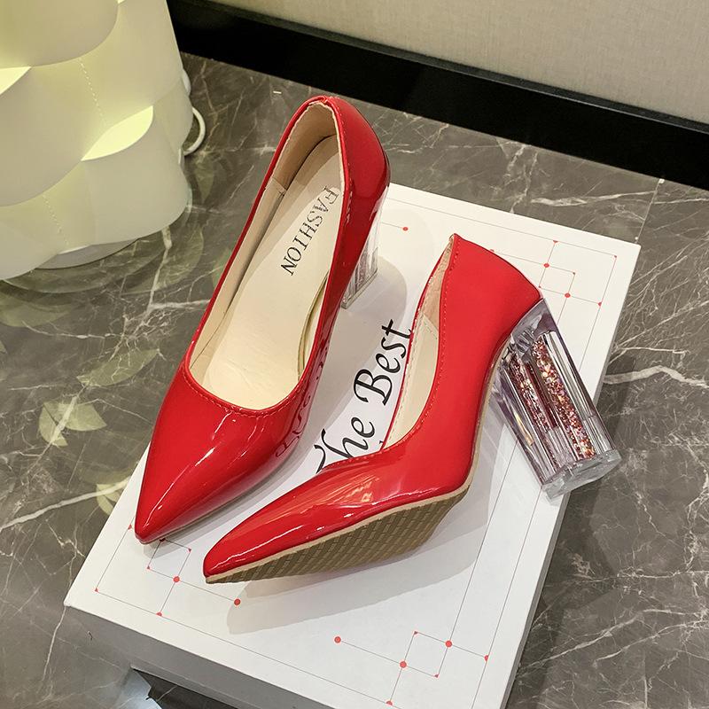 Классические женские туфли на высоком каблуке Весна/Осень новый стиль заостренный неглубокий носок прозрачный толстый каблук модные туфли на высоком каблуке