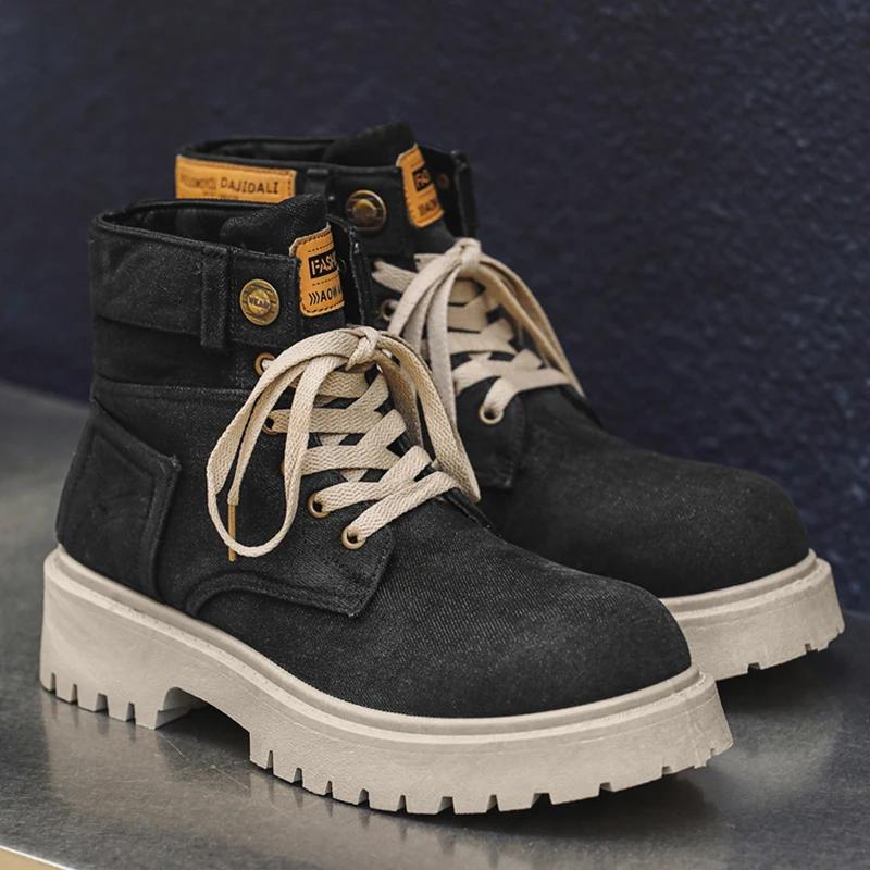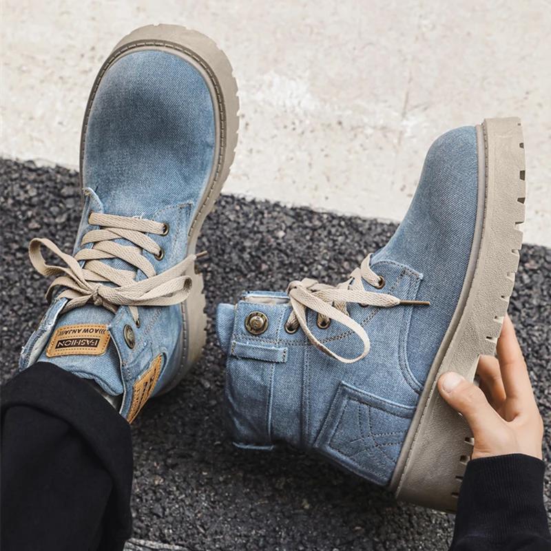 Мужские джинсовые ботинки на платформе, винтажный дизайн, мужские высококачественные удобные ботильоны, массивные, классные, повседневные, со шнуровкой, для отдыха на природе