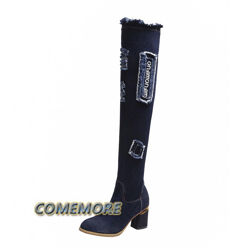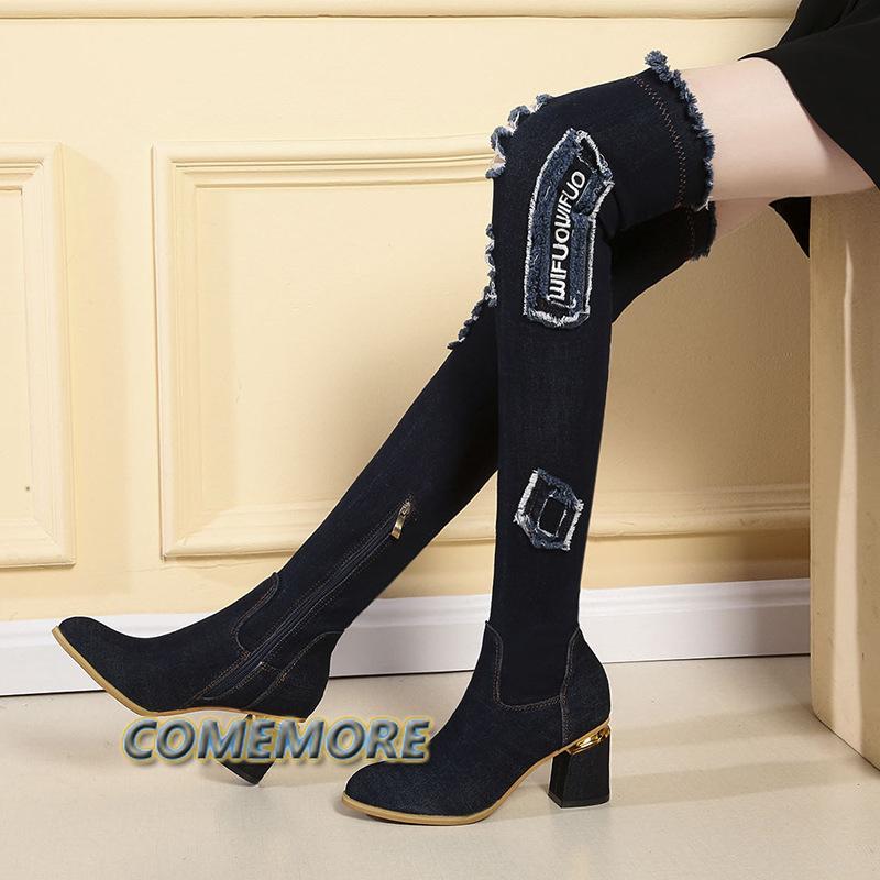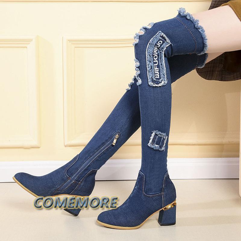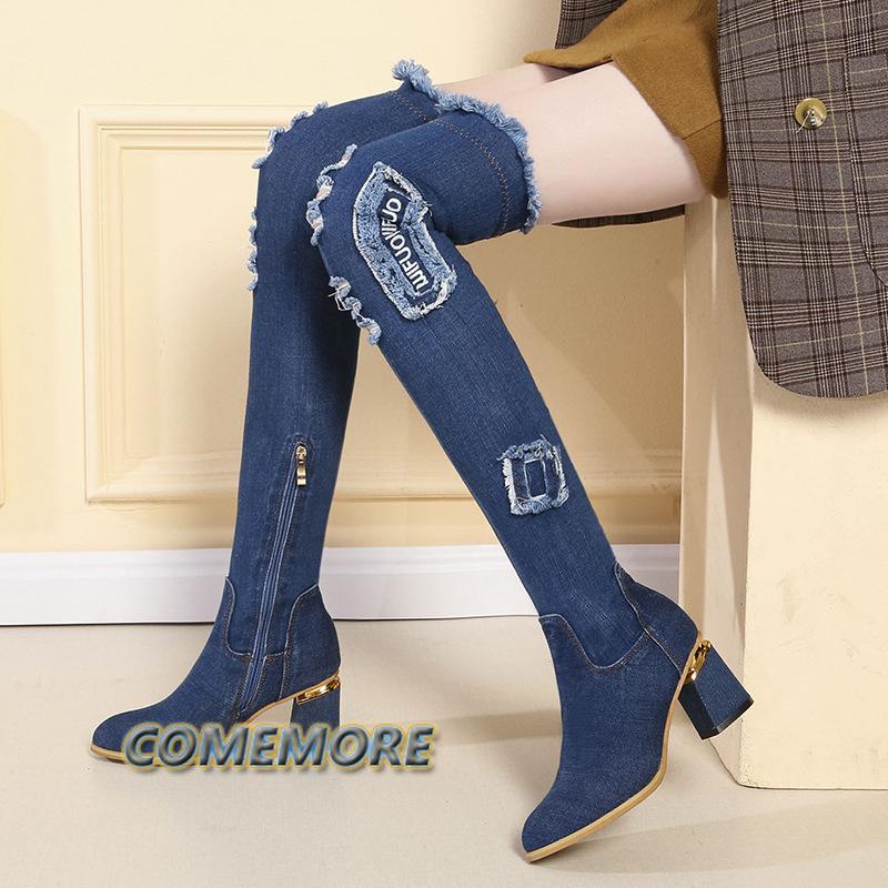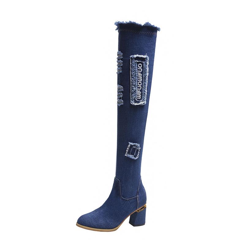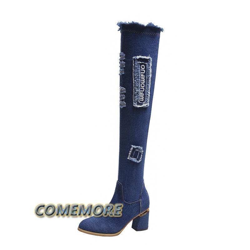 Женские джинсовые сапоги выше колена с острым носком на толстом высоком каблуке, женские осенние повседневные джинсы с вырезами и кисточками, длинные, модные дизайнерские