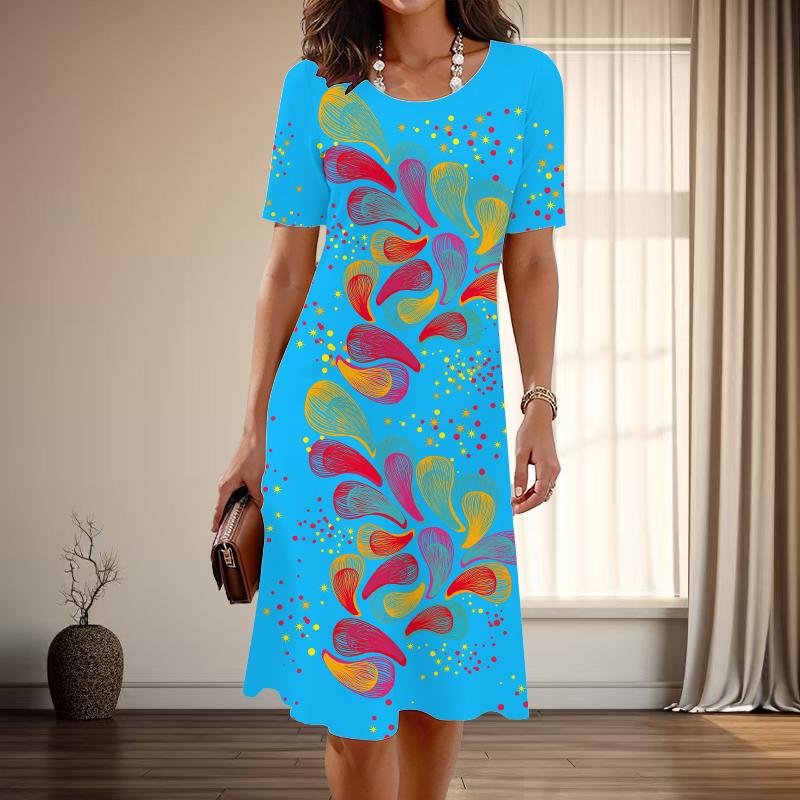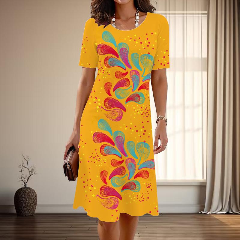 Женская мода изящный ретро узор принт лето весна короткий рукав О-образный вырез повседневные платья