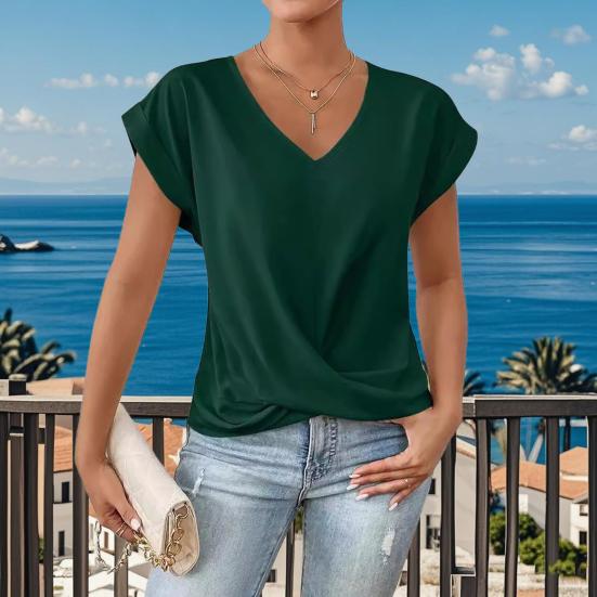 Элегантный дизайн: Дополните свой гардероб изысканным V-образным вырезом, короткими рукавами и отделкой в виде перекрестных складок, которые создают идеальный баланс между простотой и элегантностью, создавая универсальный и шикарный образ.