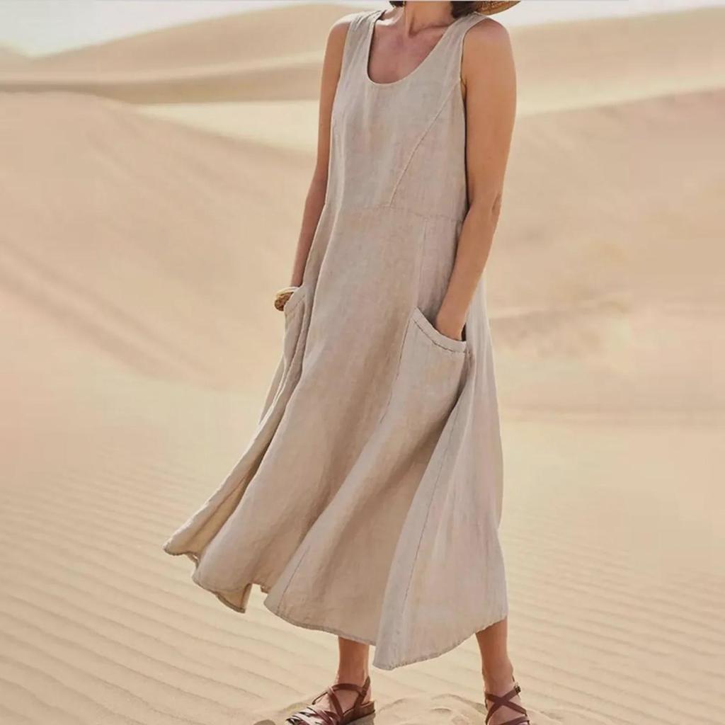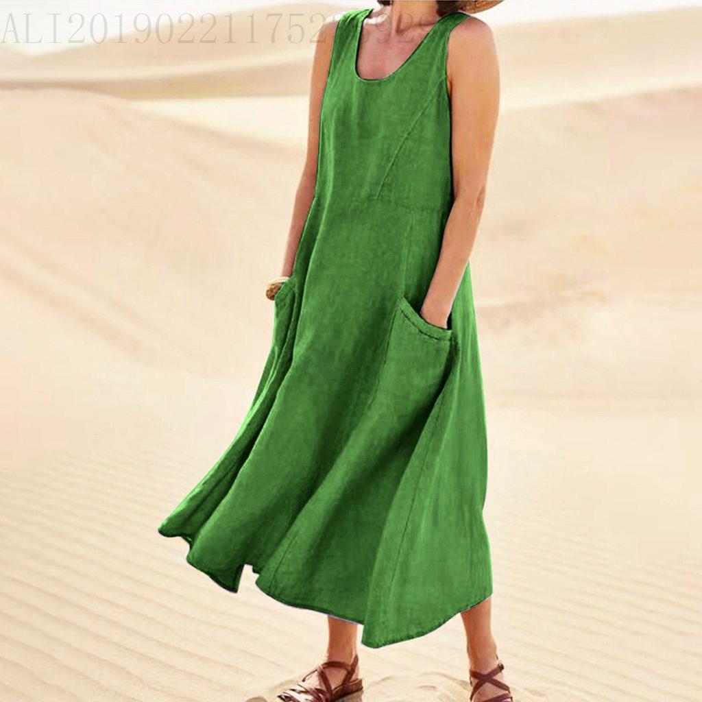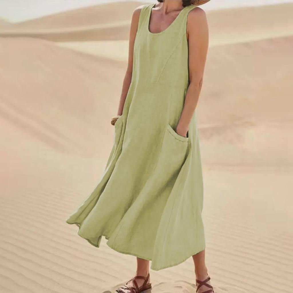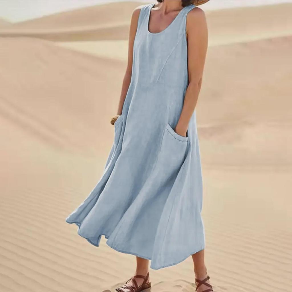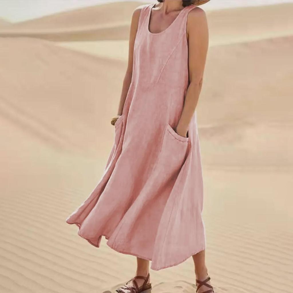 Ощутите непринужденный стиль с этим платьем без рукавов с карманами, которое идеально подходит для летних прогулок.. Это платье, доступное в 19 ярких цветах, сочетает в себе европейские и американские модные тенденции, создавая шикарный образ.. Изготовлен из дышащей смеси хлопка и льна, обеспечивает ощущение комфорта и легкости, идеально подходит для теплой погоды.. Благодаря удобным карманам он практичен и стильен, что делает его универсальным дополнением к любому гардеробу.