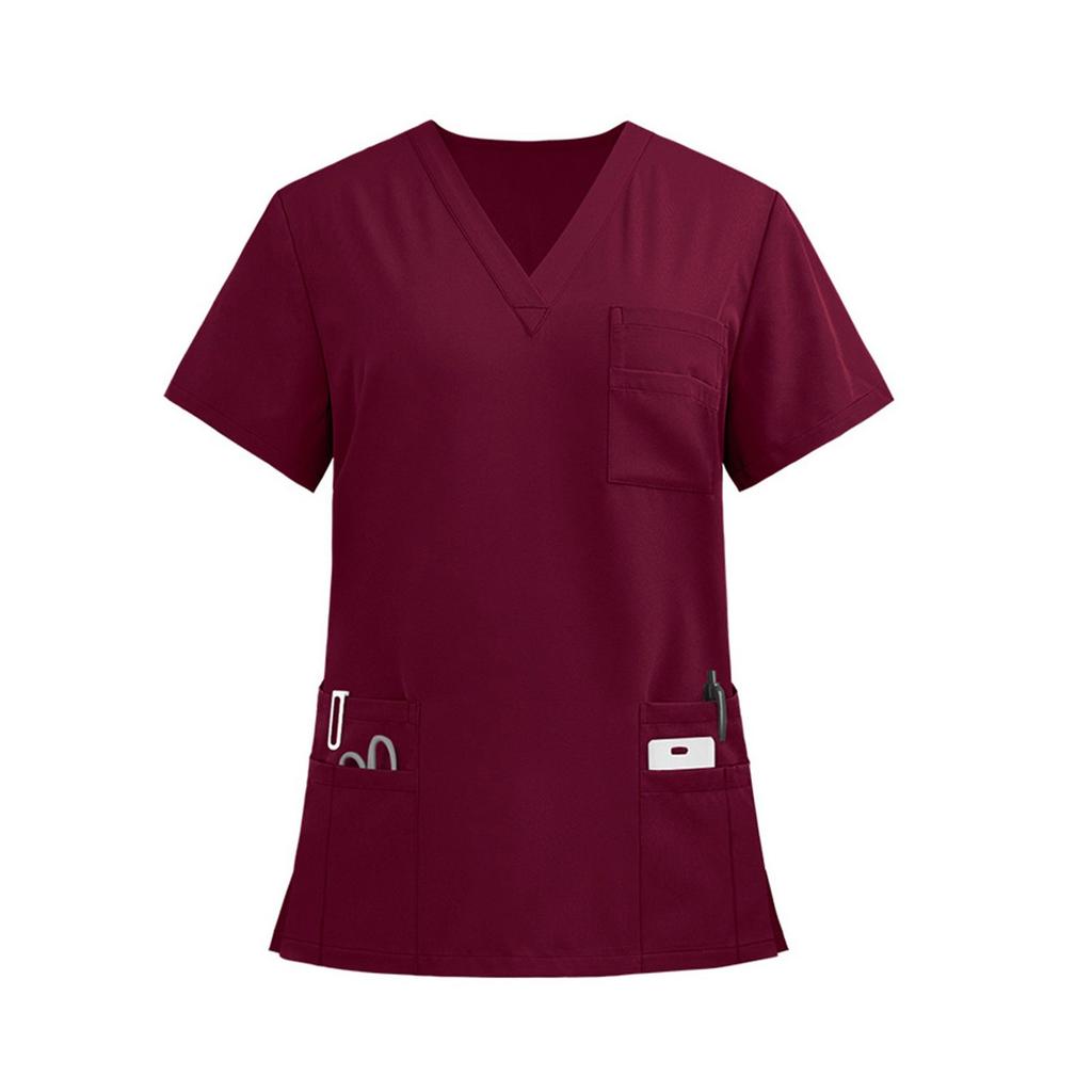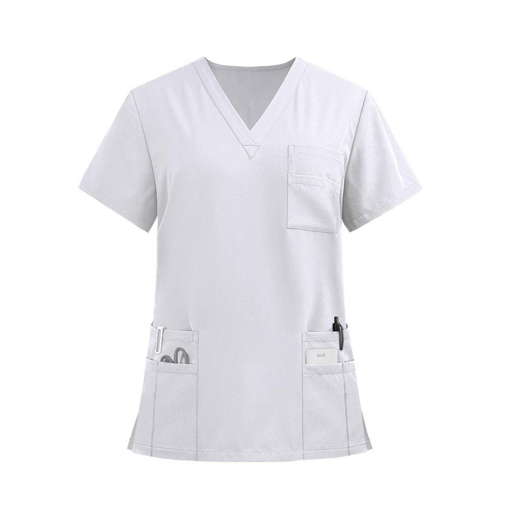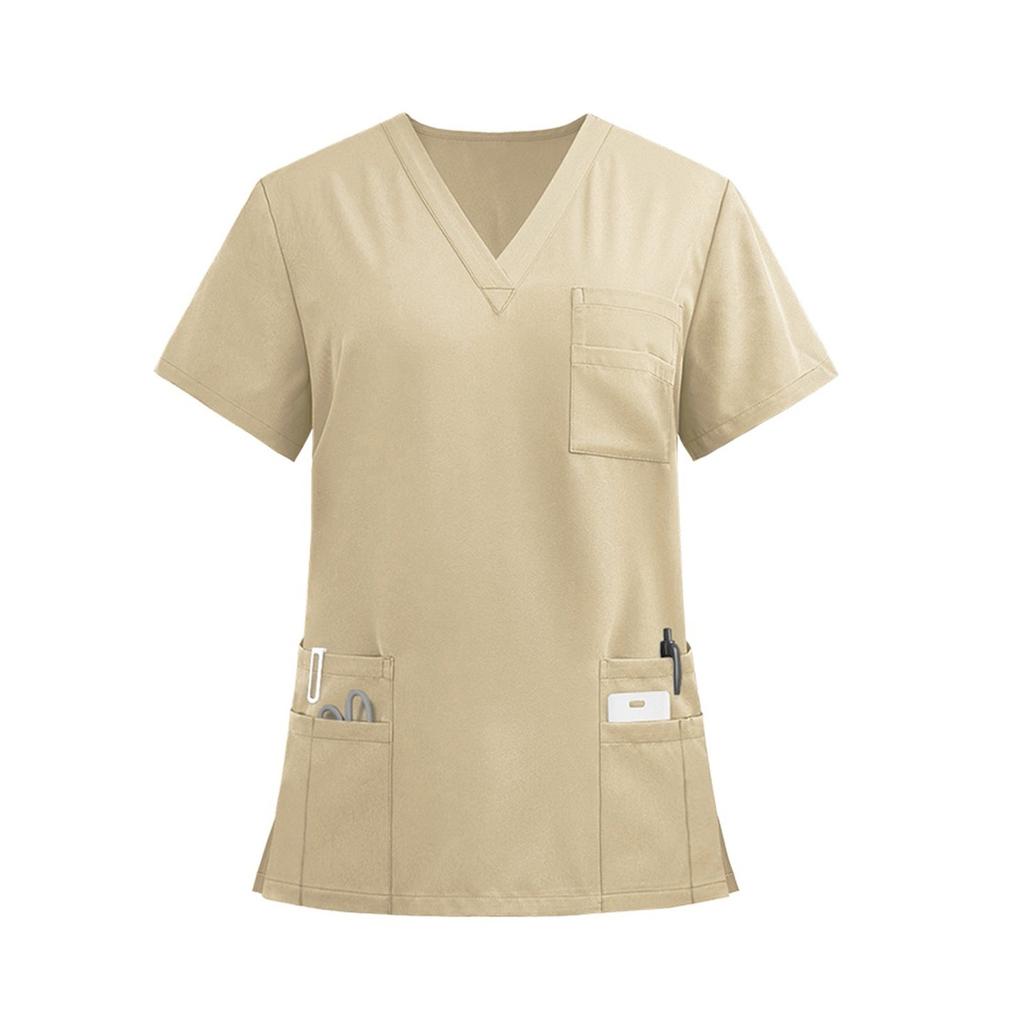 Женская легкая однотонная рубашка с V-образным вырезом, несколькими карманами и боковыми разрезами, короткими рукавами
