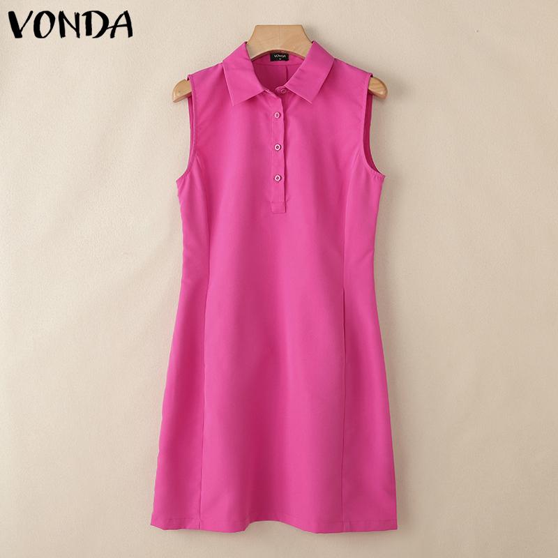 VONDA Женское летнее платье без рукавов с отворотом и пуговицами на талии, повседневное тонкое мини-платье