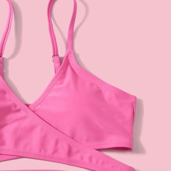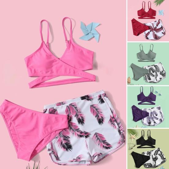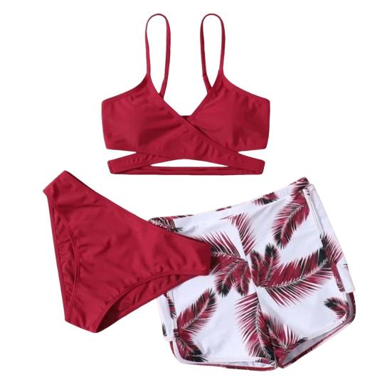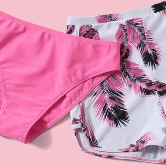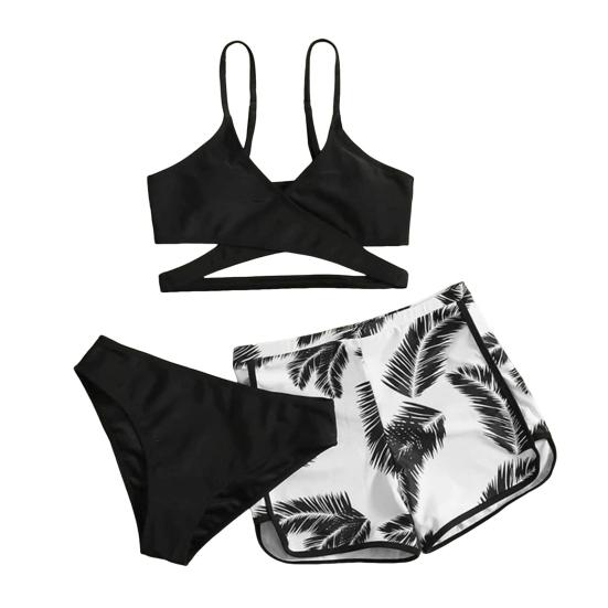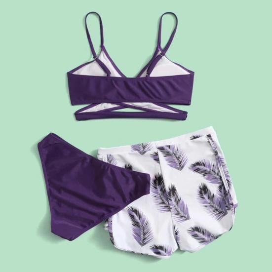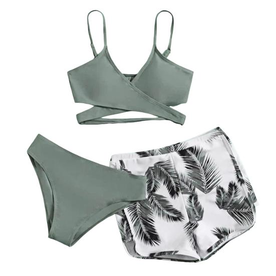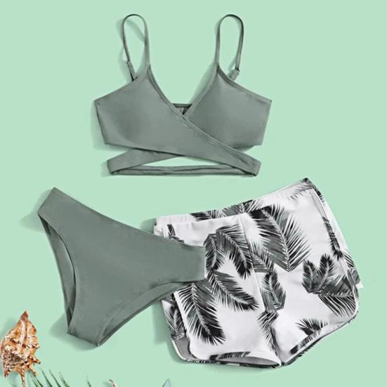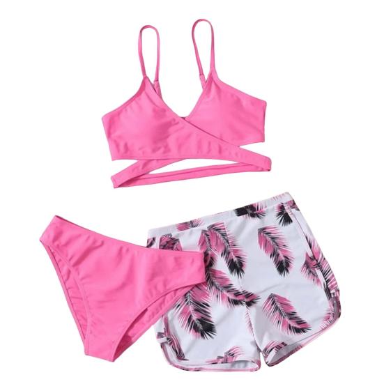 Комплект из 3 предметов: купальник с V-образным вырезом, бюстгальтер со средней посадкой, плавки, однотонный комплект бикини с шортами с принтом перьев