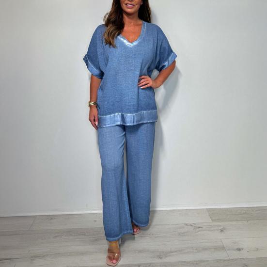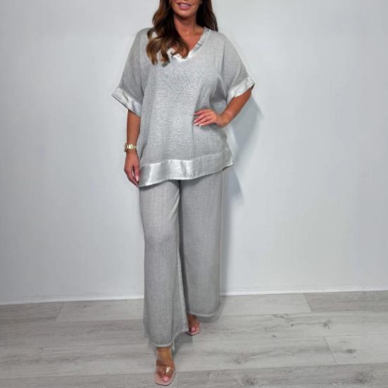 Этот стильный женский комплект из двух предметов включает в себя топ и брюки, идеально подходящие для демонстрации как профессионализма, так и женственности.. Этот повседневный комплект, изготовленный из мягкой и удобной полиэфирной ткани, подойдет для любого сезона.. Однотонный топ с V-образным вырезом и свободные брюки создают шикарный и непринужденный образ, который можно носить как вместе, так и по отдельности..