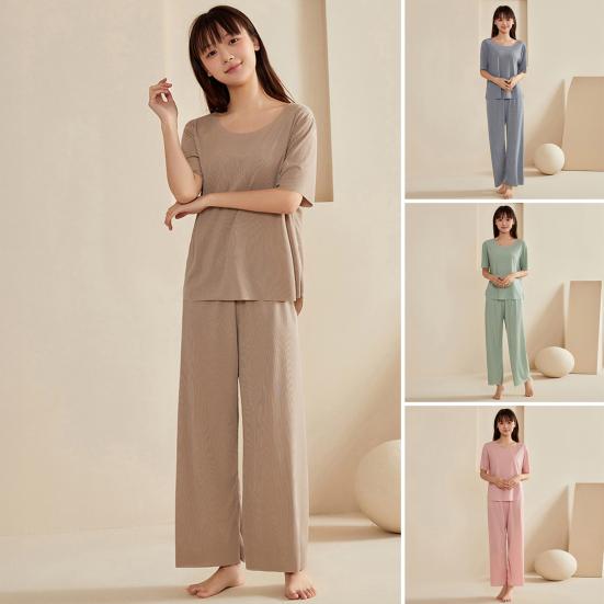 Универсальный стиль: Создайте непринужденную элегантность с этим комплектом одежды для отдыха из двух предметов: топа с короткими рукавами и брюк с девятью углами.. Простой, но элегантный дизайн делает его подходящим для различных случаев: от отдыха дома до повседневных прогулок и даже рабочих встреч.
