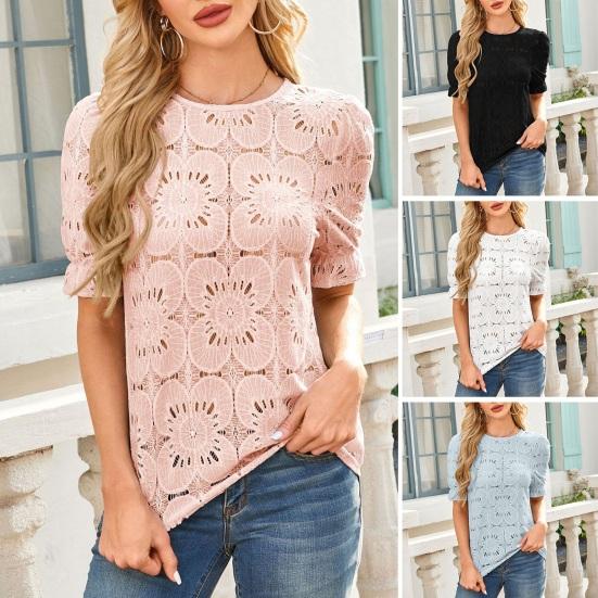 Изысканный кружевной принт и пушистые короткие рукава придают изделию нотку элегантности.. Эта повседневная рубашка с круглым вырезом и свободным кроем универсальна и легко сочетается с другими вещами..