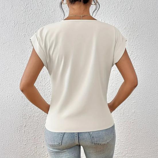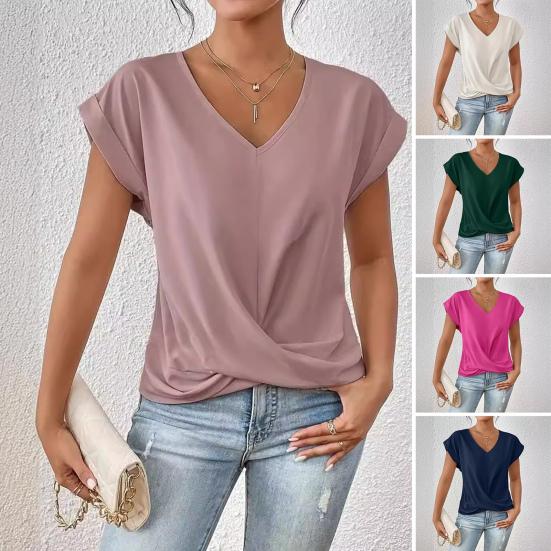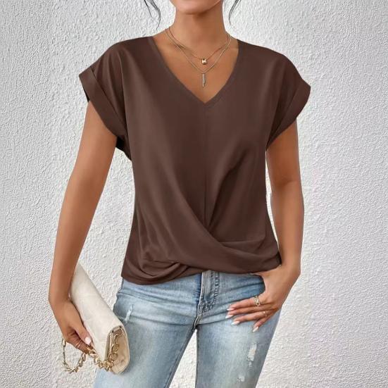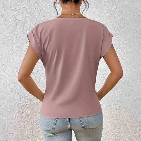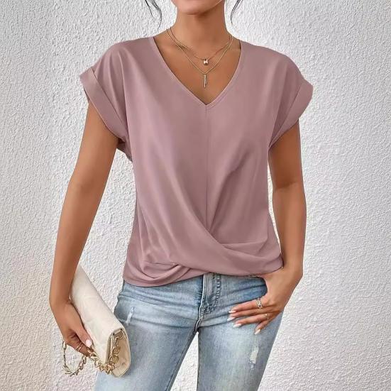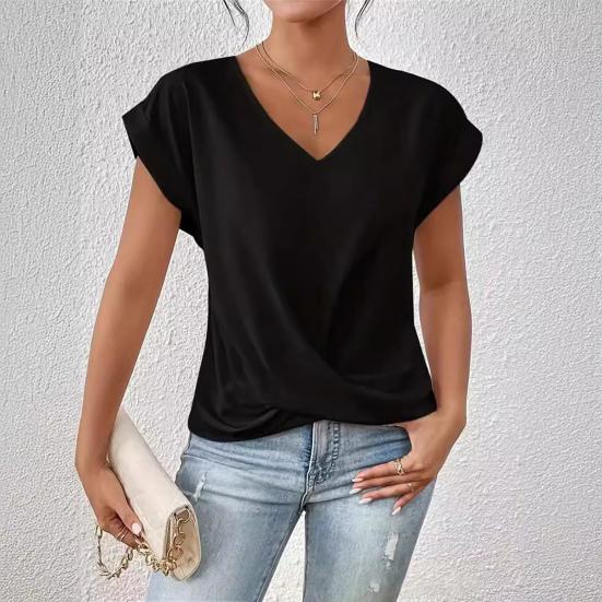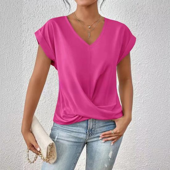 Элегантный дизайн: Дополните свой гардероб изысканным V-образным вырезом, короткими рукавами и отделкой в виде перекрестных складок, которые создают идеальный баланс между простотой и элегантностью, создавая универсальный и шикарный образ.