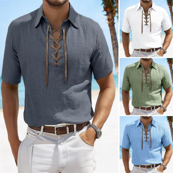 Представляем универсальную мужскую футболку — незаменимый предмет гардероба, который легко сочетает в себе стиль и комфорт.. Этот однотонный топ имеет элегантный лацкан, короткие рукава и модный дизайн со шнуровкой и V-образным вырезом, что делает его идеальным выбором для различных случаев..