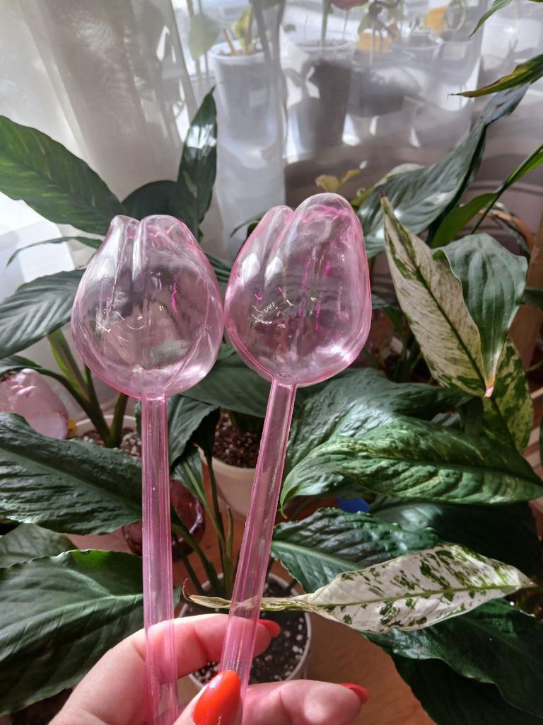 Автополив для комнатных растений Автополив для растений в форме тюльпана — это удобное решение для полива цветов и выглядит эстетично. В комплекте идет 4 штуки. Колба выполнена в виде цветка - тюльпана. Просто наполняем колбу водой, втыкаем в грунт — и автополив начнёт равномерно подавать влагу корням растения. Такой капельный полив предотвращает пересыхание и переувлажнение, обеспечивая идеальный баланс влажности почвы. Идеальное решение на время отпуска, командировки. Можно использовать не только для воды, но и для жидких удобрений — растения будут получать подкормку постепенно и равномерно. Экономия времени, забота о растениях и стильный вид — всё в одном. Советую, удобное решение.