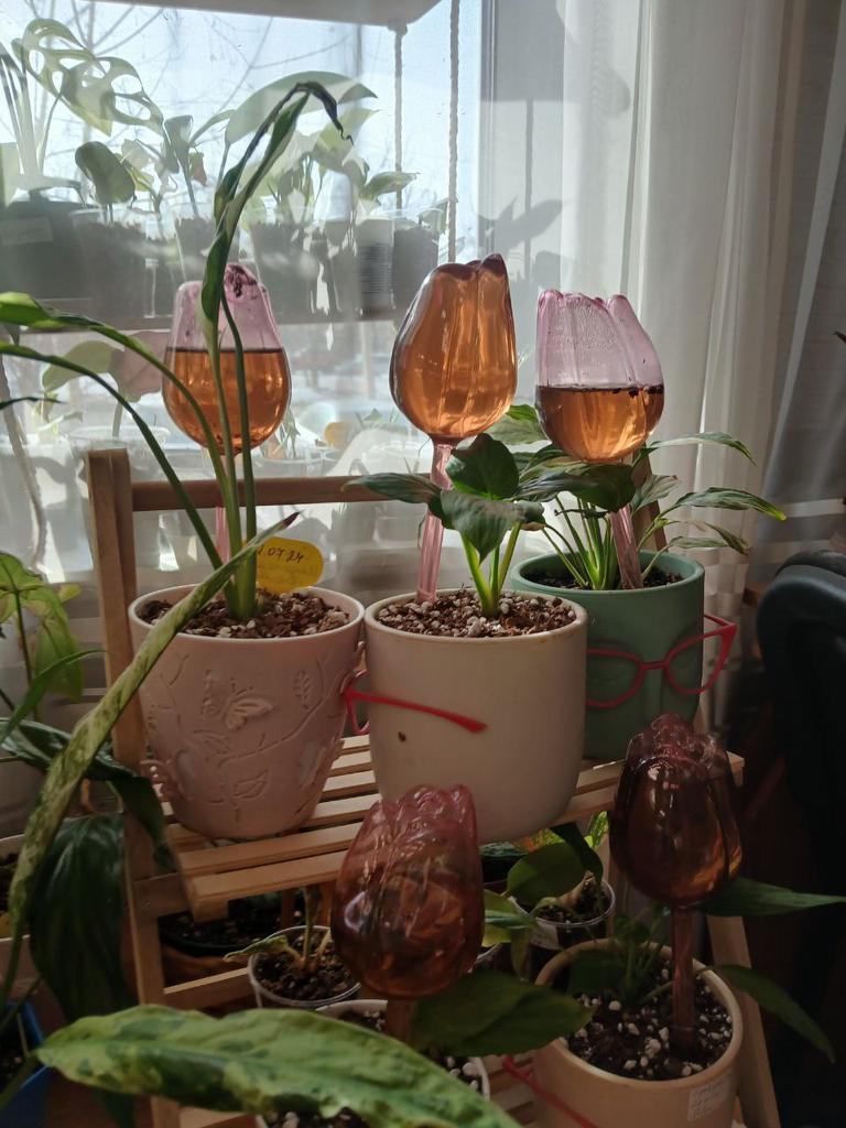 🌺 Колбы для полива цветов 🌺 Доставка долгая 70 дней до Иркутска в сборной посылке!! 🎈 Трек живой! Упаковано отлично! Теперь мои растюшки цветут круглый год! 🌷 Отличные колбы для полива цветов в форме тюльпанов) 🌷🌷🌷 Беру не первый раз, очень удобные и полезные! В этот раз взяла комплект из 8 штук! И уже заказала ещё, скоро прибудут! Прозрачные колбы, в которые вода наливается через длинную трубку и втыкается в землю! По мере необходимости вода вытекают в землю и увлажняется! Если колбы поставить вертикально вода будет впитывается медленно. Для более интенсивного полива колбу надо ставить под наклоном! Вообще рекомендуют в землю ставить возле корней, но я ставлю возле стенки горшка, так как я боюсь повредить корни! 🤩Рекомендую👍 Всем удачных покупок! 💞 И спасибо за ваши 💕💕