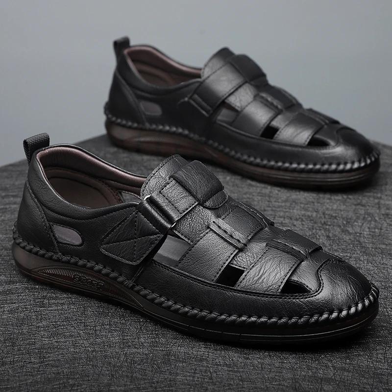 Новые мужские летние модные сандалии с завязками на носке, сандалии из натуральной кожи для мужчин, мокасины с круглым носком, легкие удобные пляжные туфли на плоской подошве