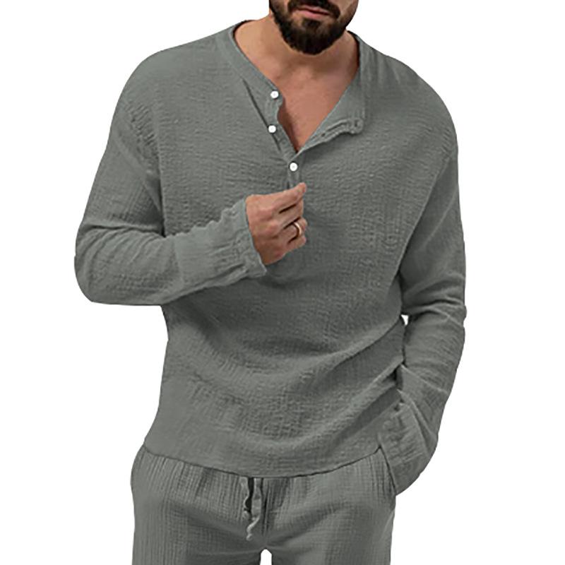 Новая осенняя футболка с длинным рукавом, мужская свободная футболка с V-образным вырезом на пуговицах