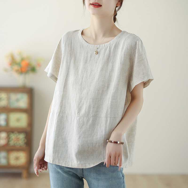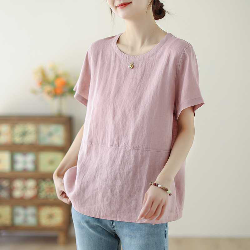 Летняя новая рубашка с короткими рукавами из хлопка и льна, простая, свободная, повседневная, универсальная, с круглым вырезом и короткими рукавами