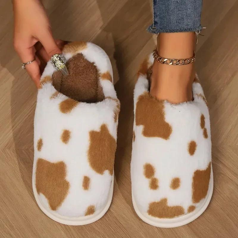 Зимние тапочки новые пестрые плюшевые пушистые тапочки для домашнего использования нескользящие теплые плоские хлопковые тапочки женские коровьи панталончики Mujer