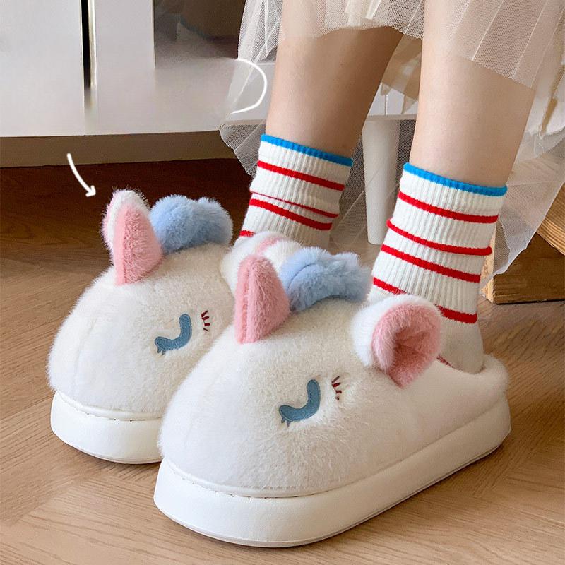 Женские тапочки из хлопка 2024 года, зимние, новые, рождественские, с милым мультяшным единорогом, для улицы и дома, теплые, нескользящие, удобные, напольные, хлопковые тапочки