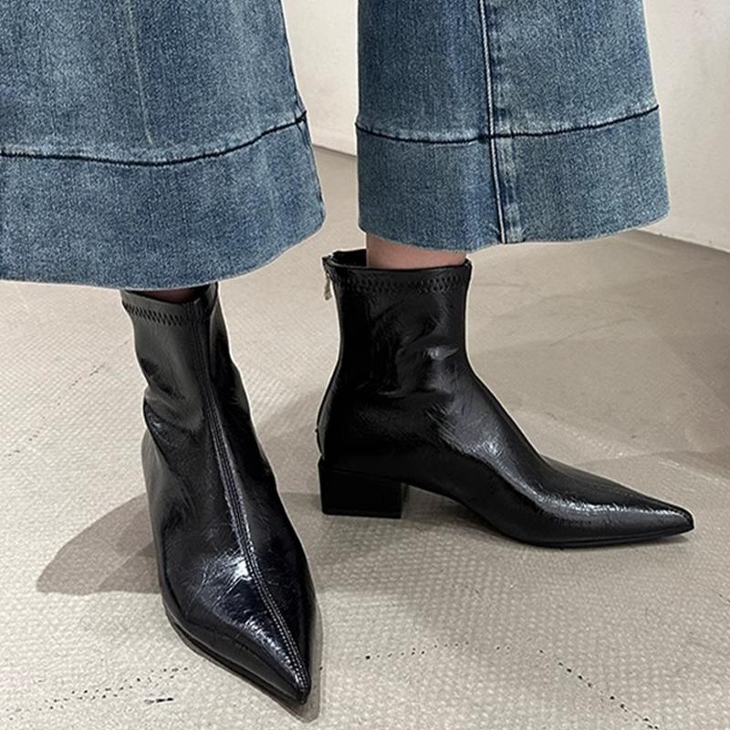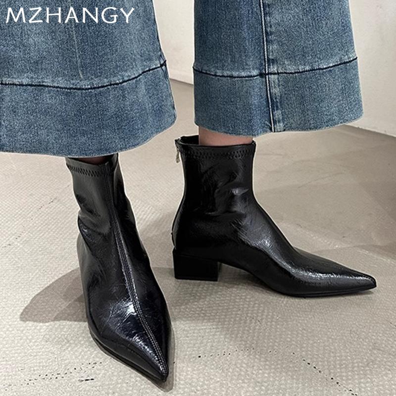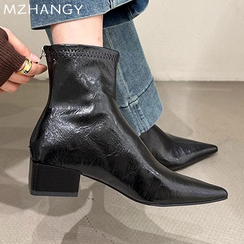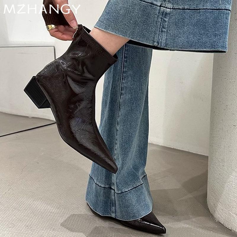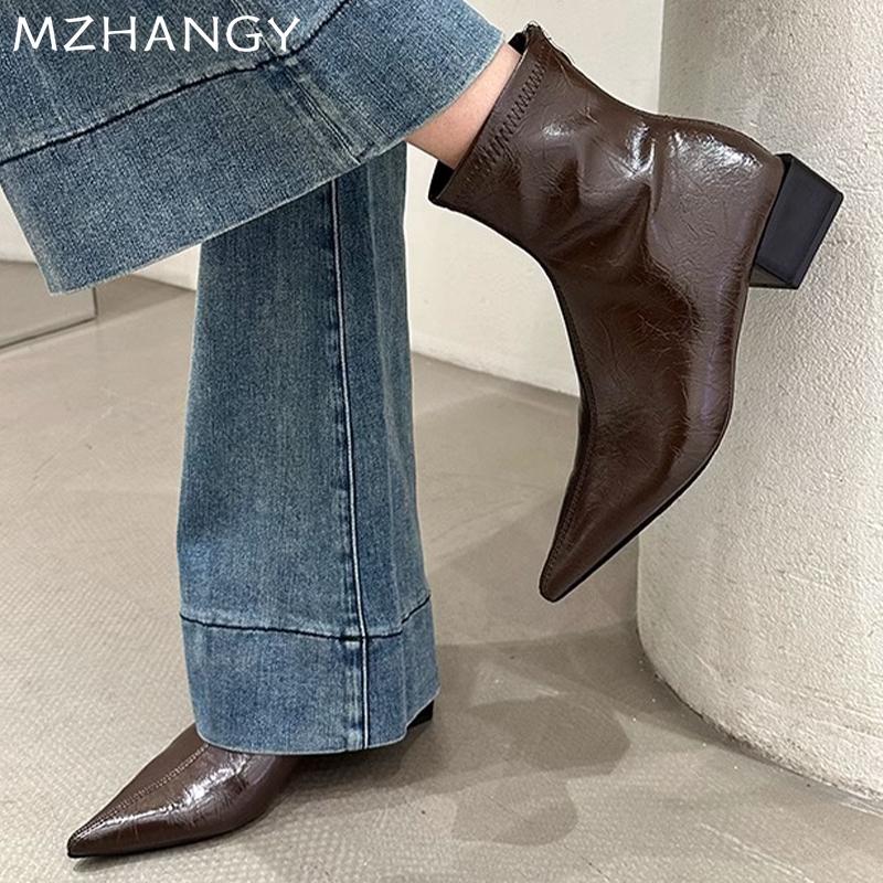 Женские кожаные ботильоны с острым носком, элегантные туфли на среднем каблуке, женская обувь 2025 года, зимние туфли-лодочки в стиле ретро, удобные ботинки челси, женские ботинки