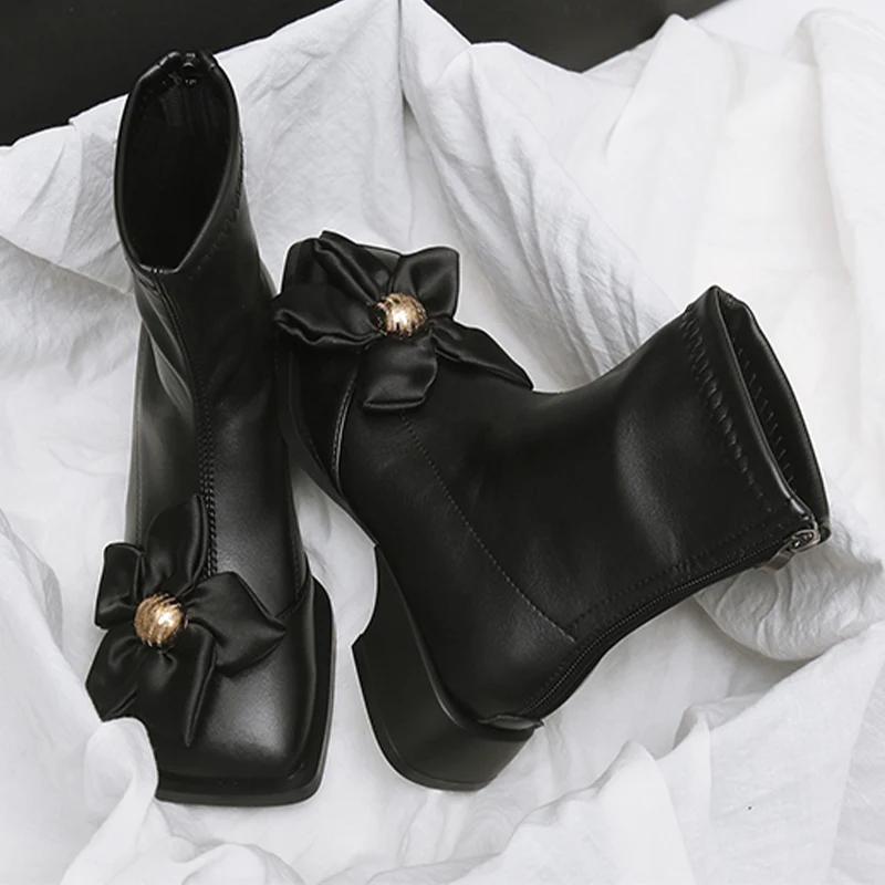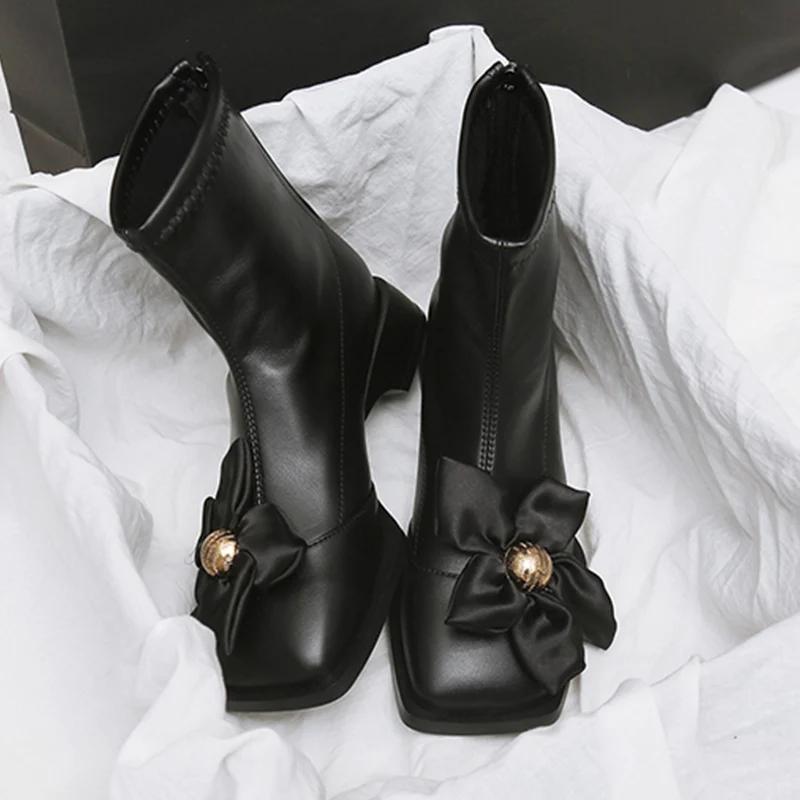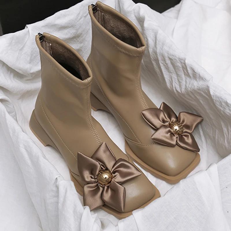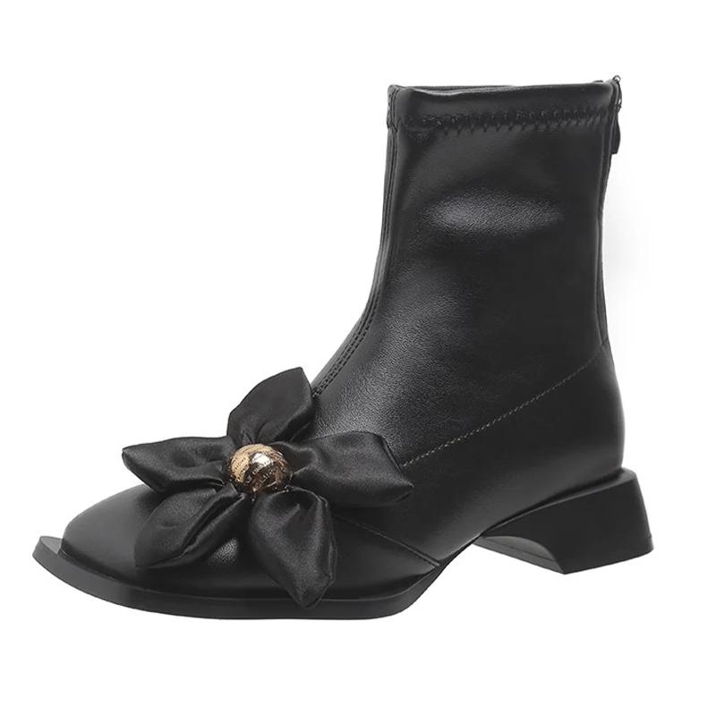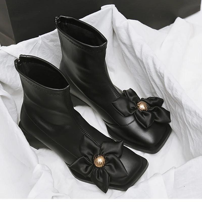 Женские ботильоны с цветочным квадратным носком, массивные кожаные туфли, женская модная обувь 2024 года, зимние ботинки на низком каблуке, модная новая женская обувь на молнии