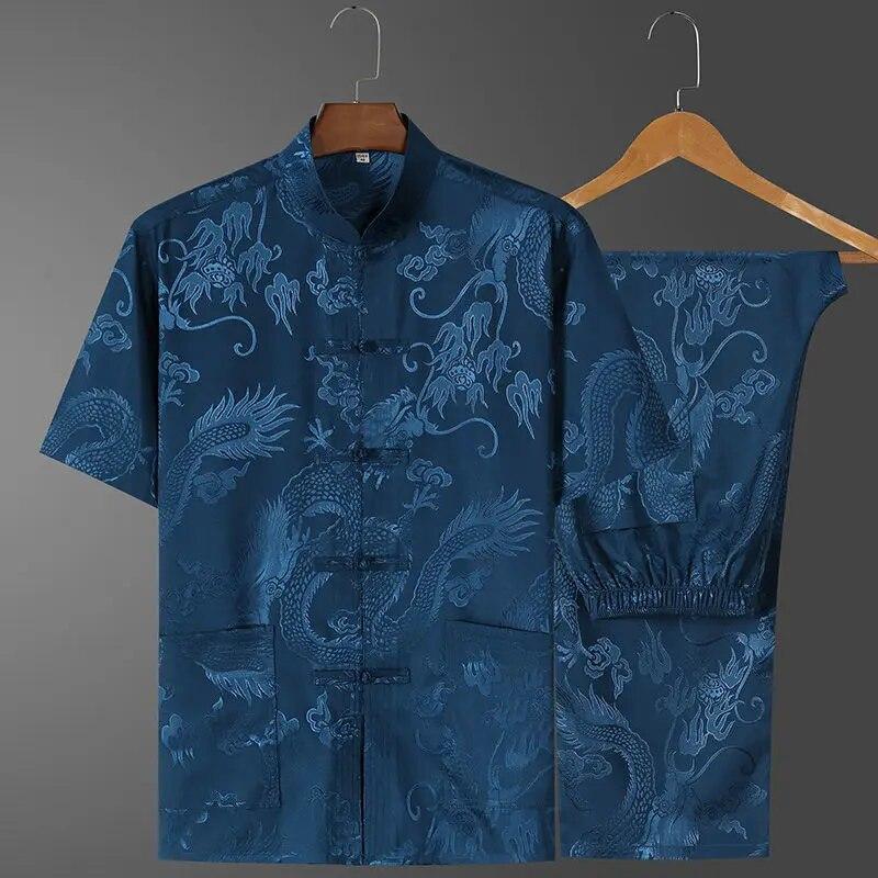 Китайский костюм Тан с воротником-стойкой, мужской винтажный костюм Ханфу с короткими рукавами, Cheongsam на пуговицах, повседневная одежда Dragon Kong Fu