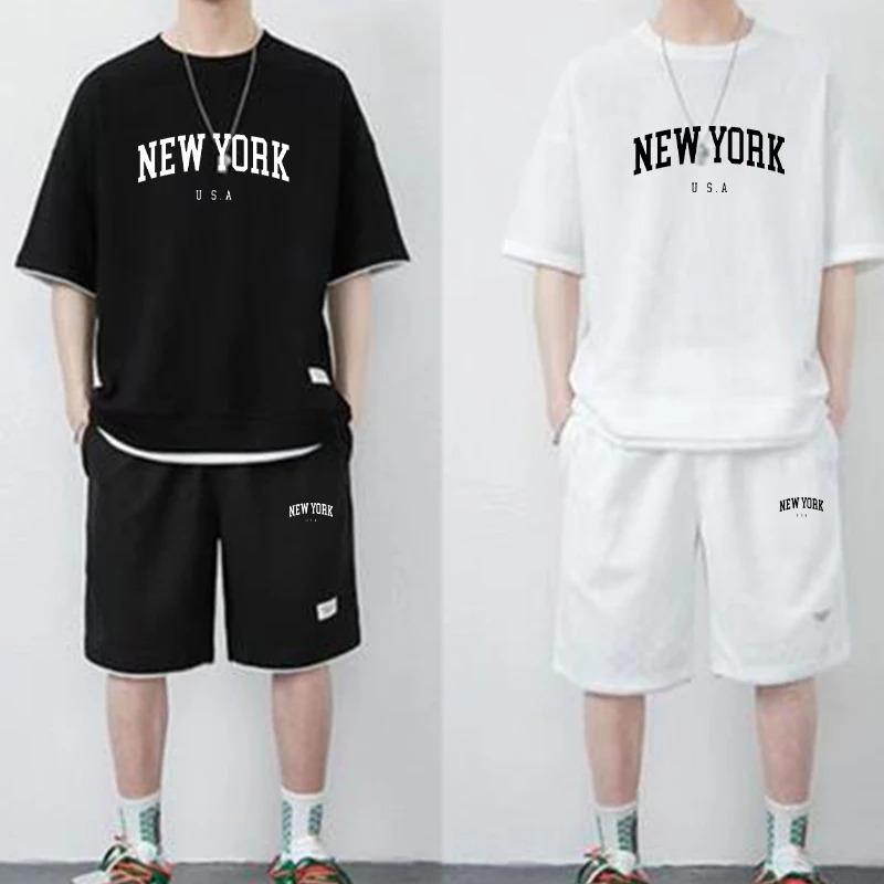 New York Футболки Короткие штаны Костюм из двух частей Мужской летний модный спортивный костюм с коротким рукавом Комплект Шорты Женский уличный стиль Футболки Топы