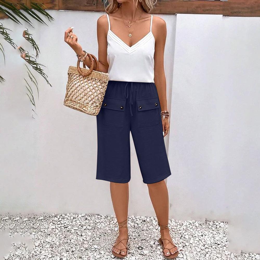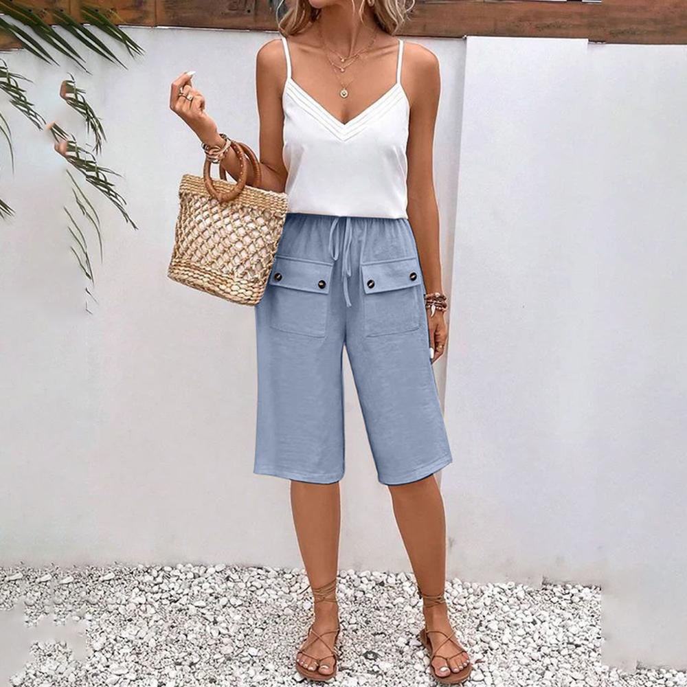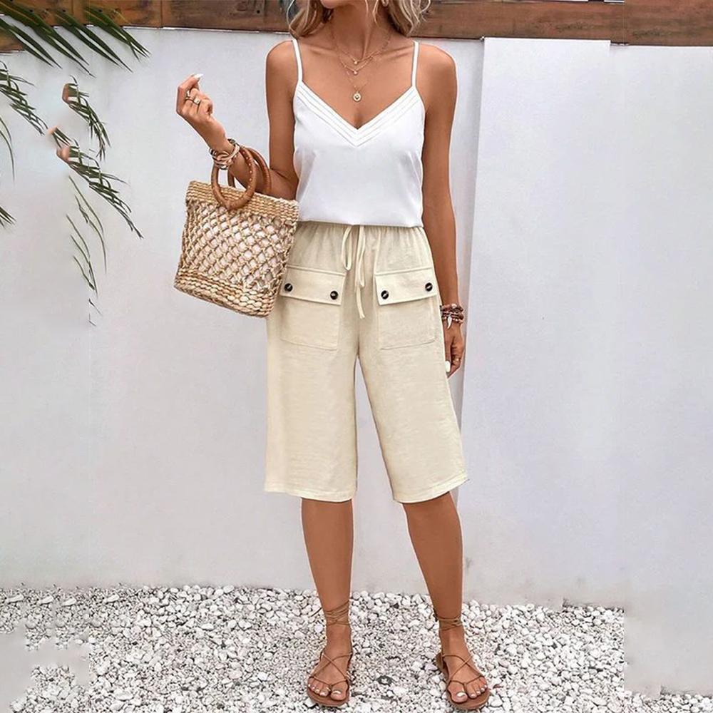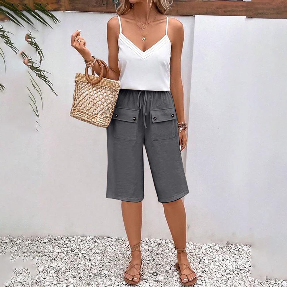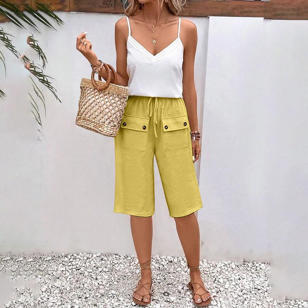 Женские уличные повседневные брюки-бермуды с передними карманами и эластичным поясом, летние однотонные универсальные брюки длиной до колена с завязками на шнурке, женские