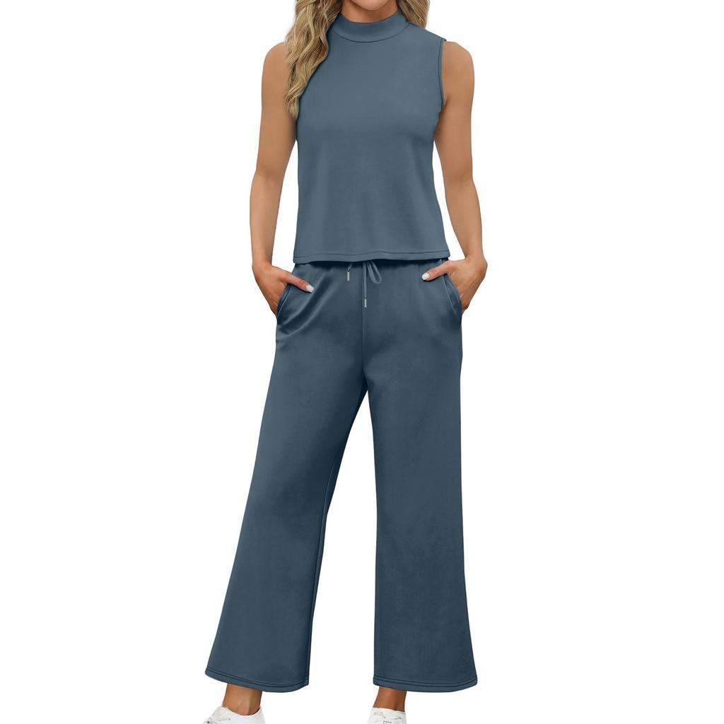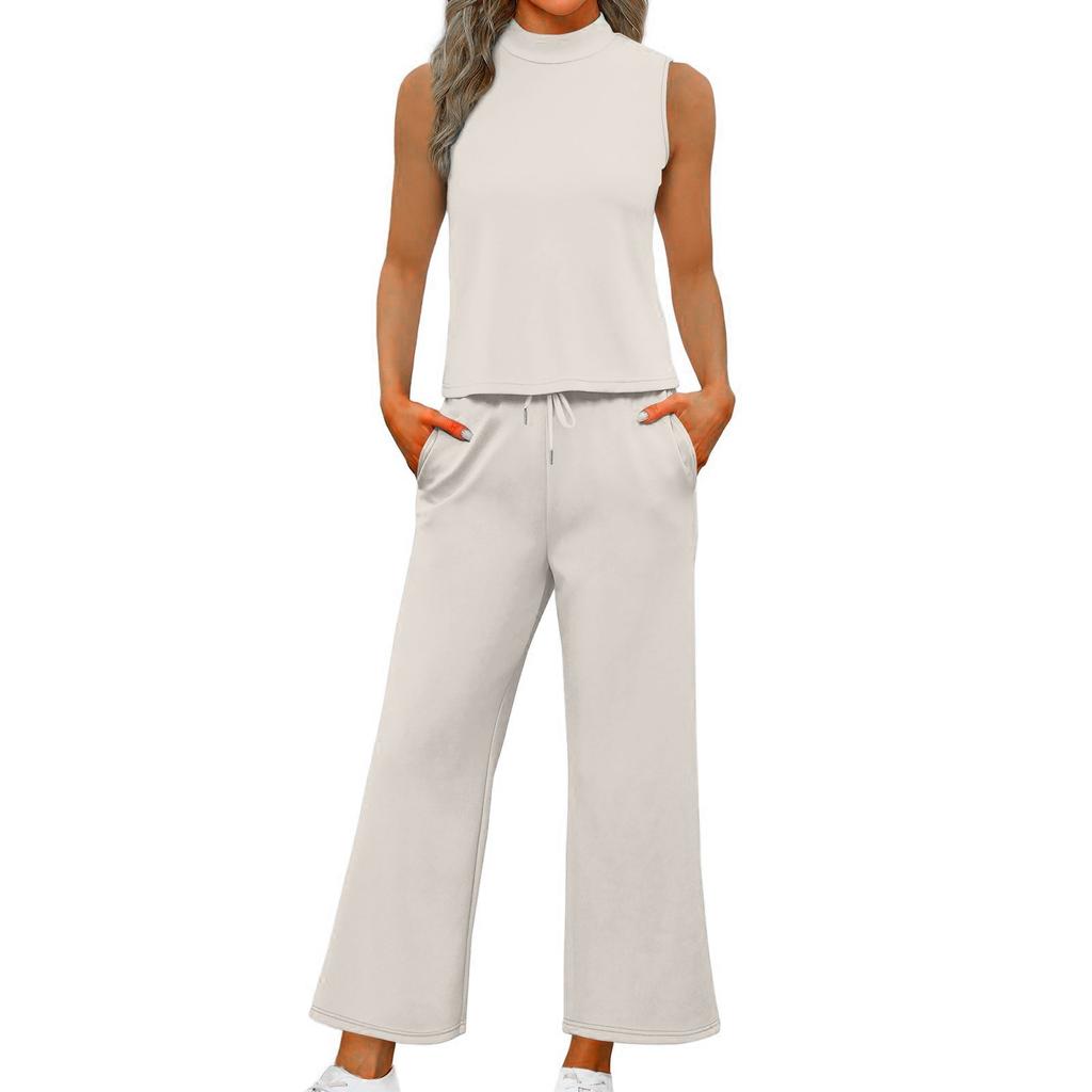 Женский повседневный модный комплект без рукавов с широкими свободными брюками и высоким воротом