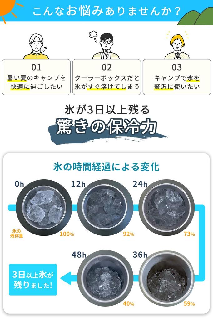 [Удивительная способность сохранять холод] 🦊Мы наблюдали за прогрессом, пока весь лед не растаял каждые 12 часов, и подтвердили, что лед сохранялся более 3 дней. (Испытано в среде с комнатной температурой 24°C ± 2°C, вдали от прямых солнечных лучей.)