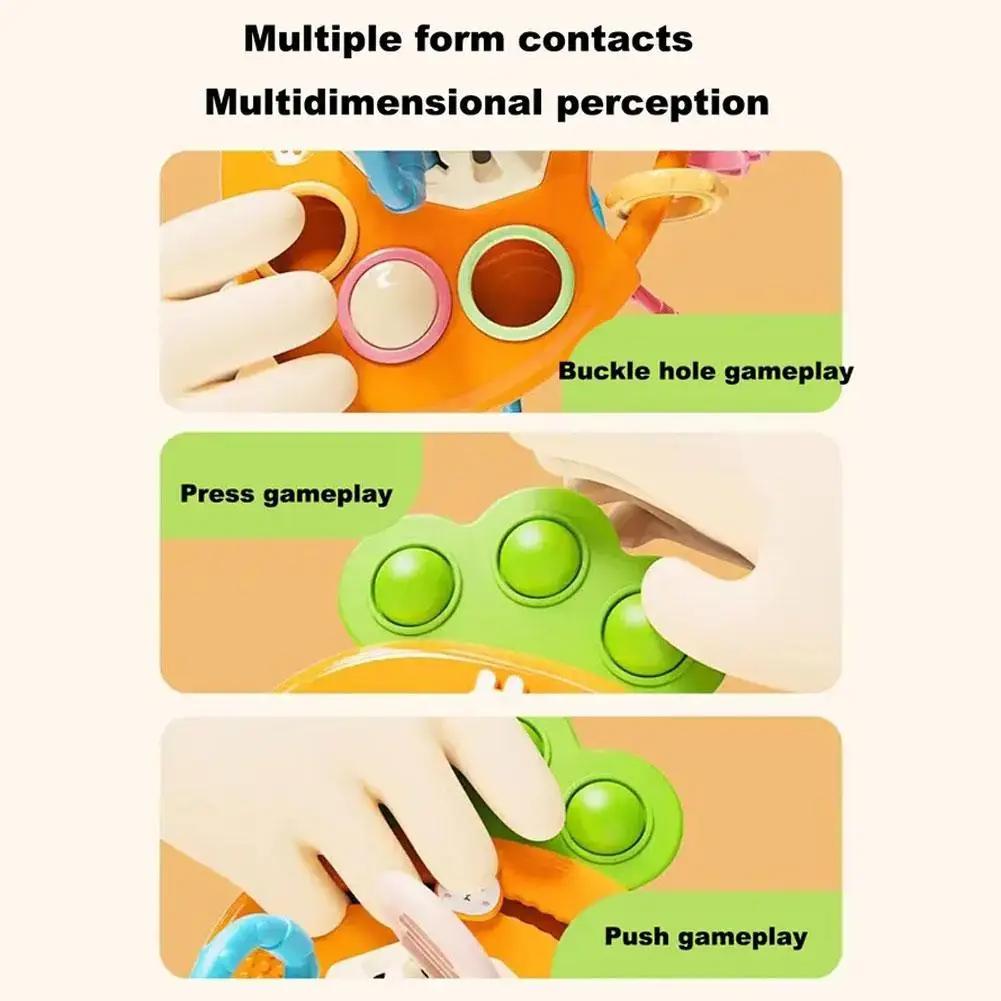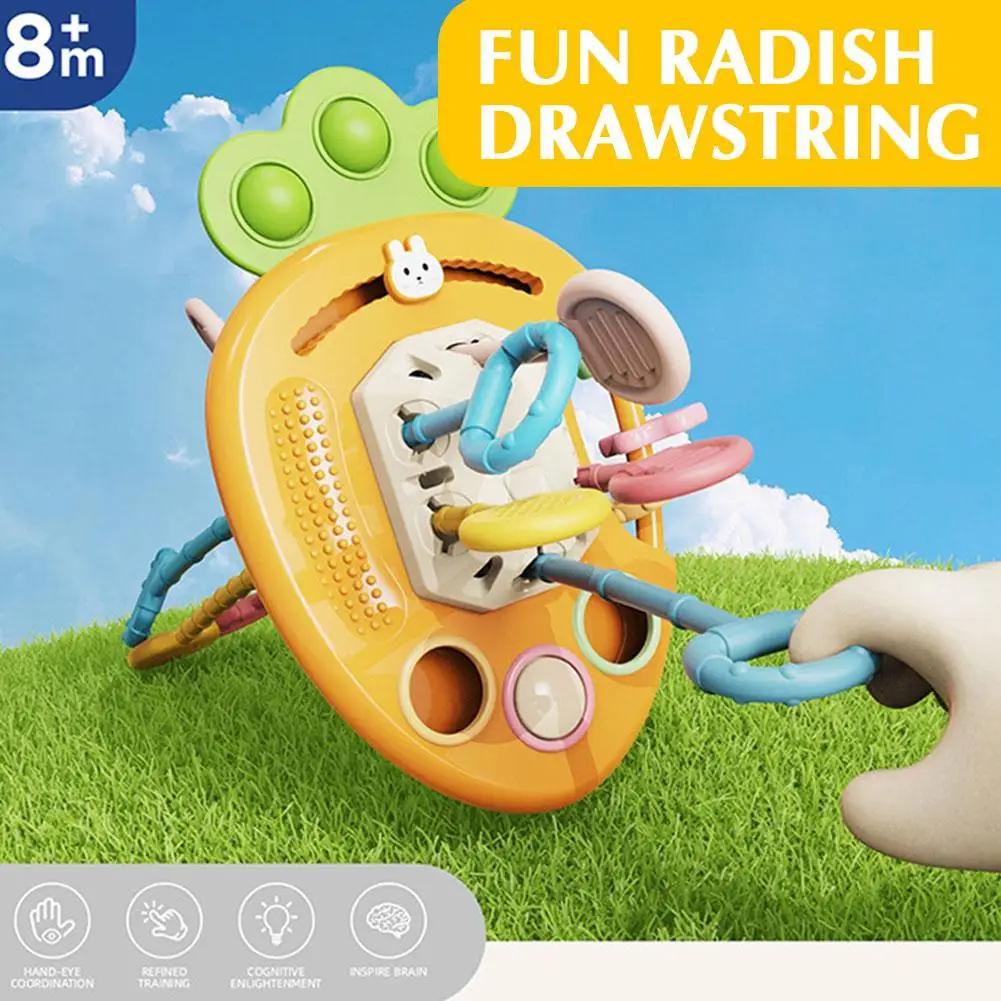 4. Забавные игрушки-морковки Монтессори для детей от 6 месяцев: Эта игрушка аминирована для улучшения сенсорных способностей и моторики ребенка.. Благодаря красочной мягкой кнопке вверх-вниз она может привлечь ребенка к прикосновениям и нажатиям, что стимулирует любопытство малыша и тренирует гибкость его пальцев.. Кроме того, текстуры веревок и концов веревок также разнообразны, малыш может протянуть все веревки через одну сторону на другую, чтобы почувствовать их различия.. Это отличный способ развивать сенсорику осязания, распознавание цвета и моторику.