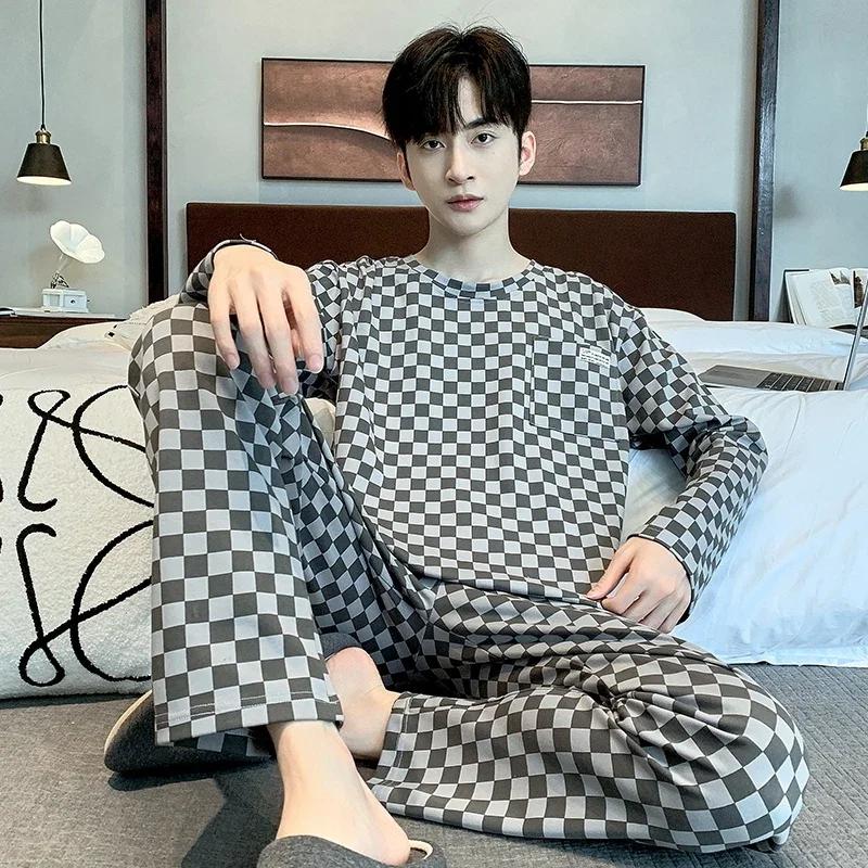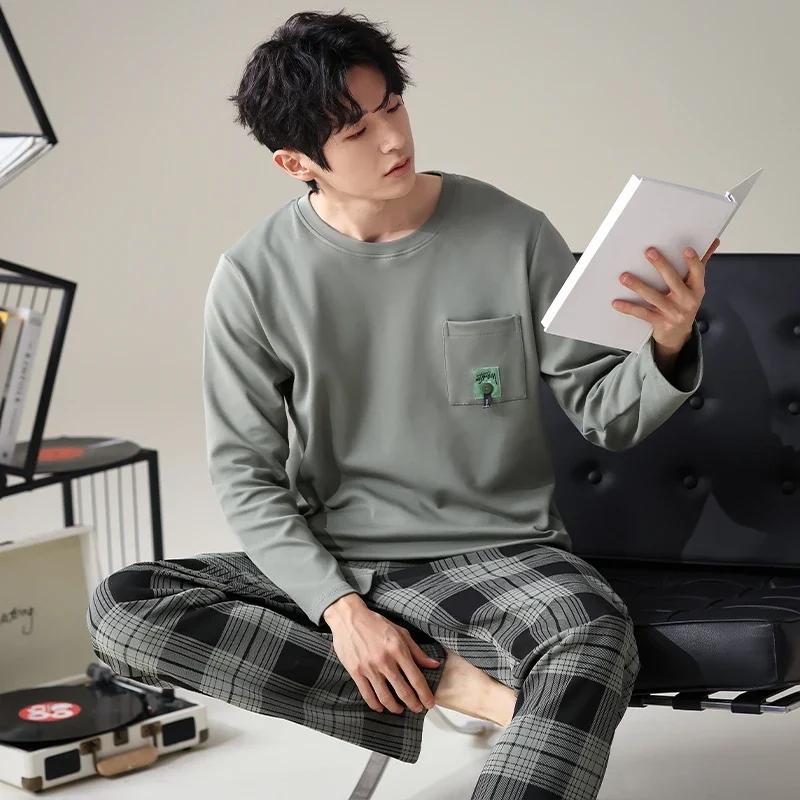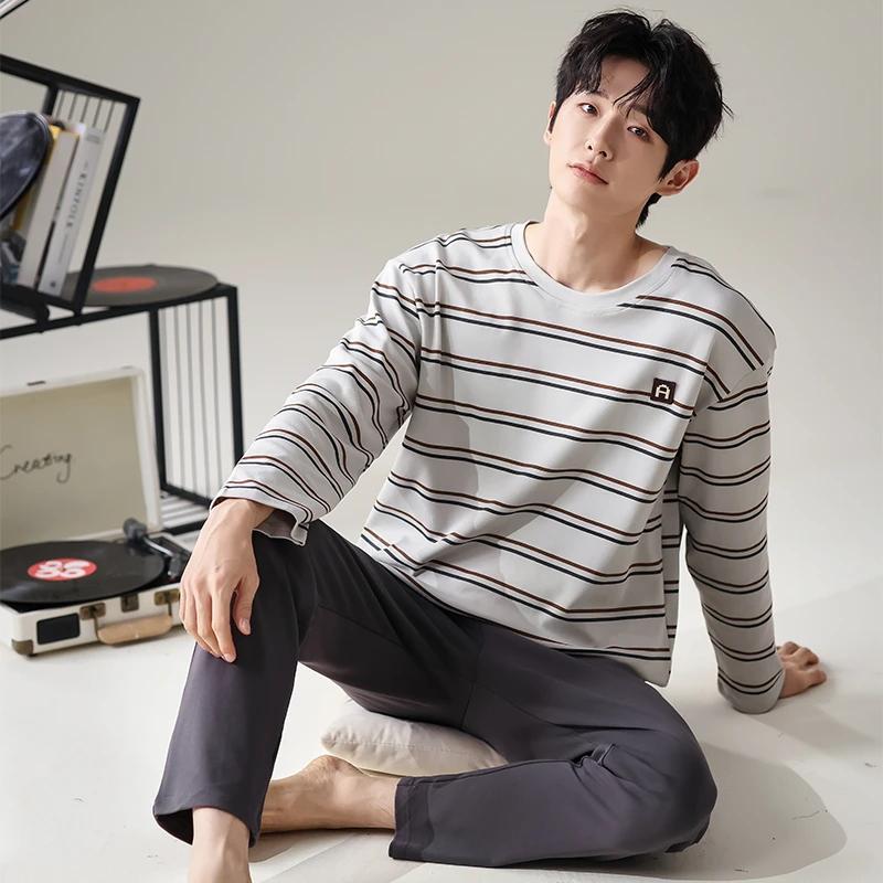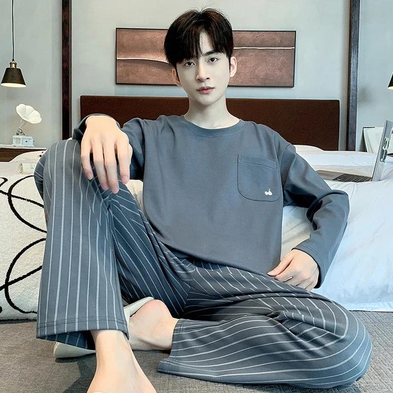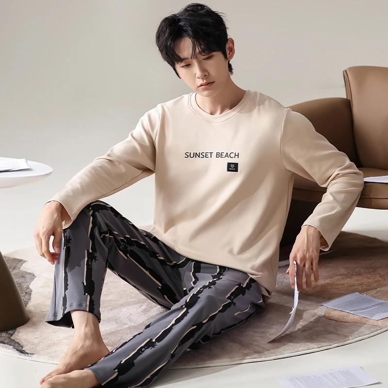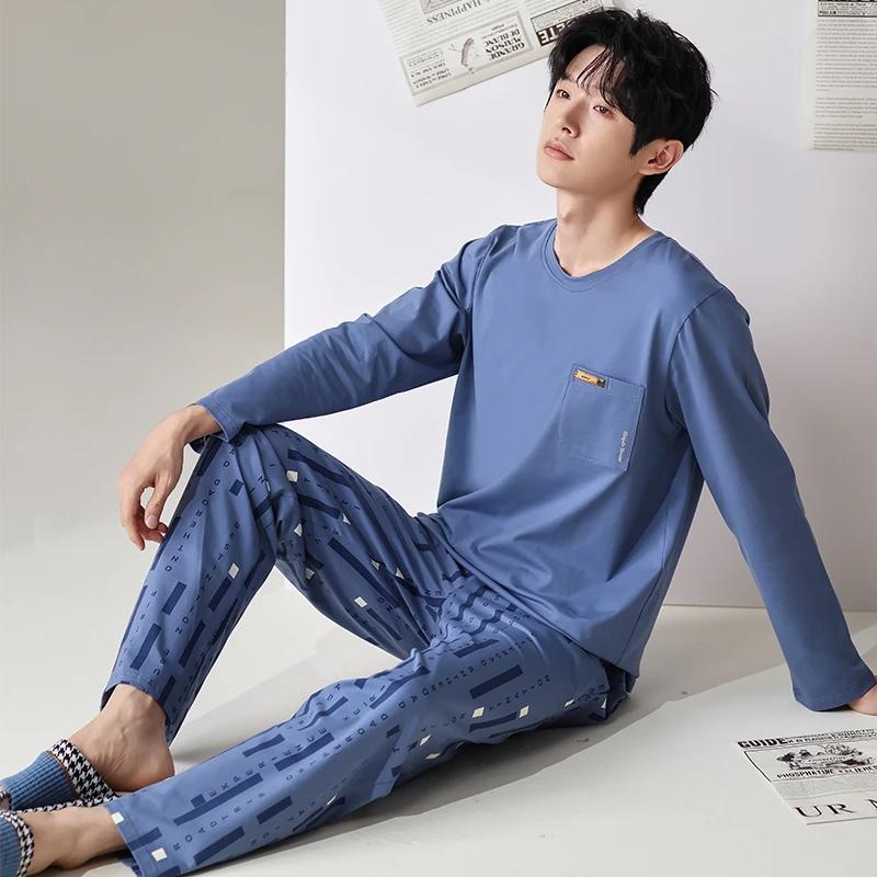 Модная мужская пижама, пижама для толстяков, одежда для отдыха, домашняя одежда, хлопковая пижама с длинными рукавами, длинные брюки, комплект для отдыха