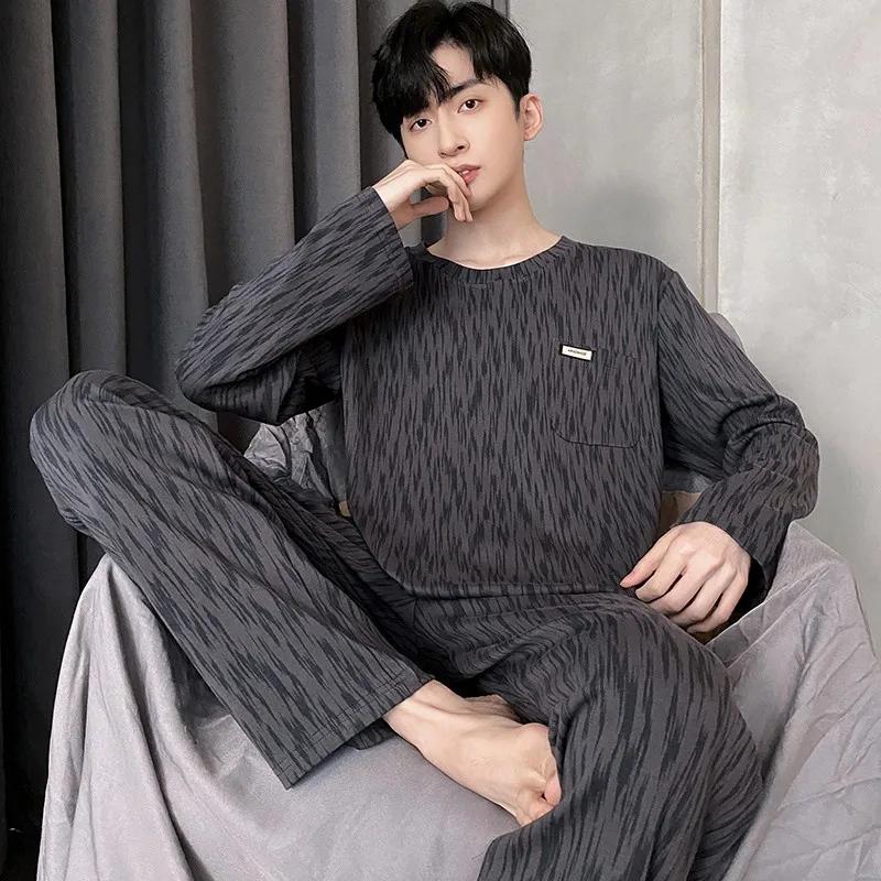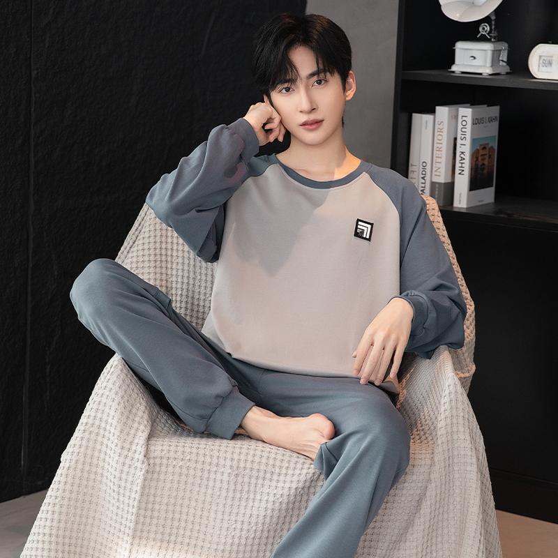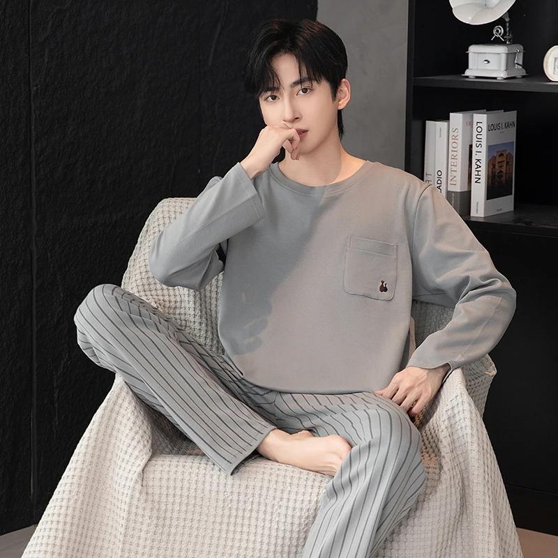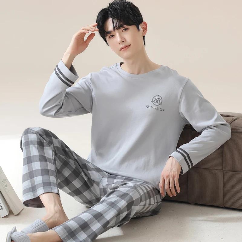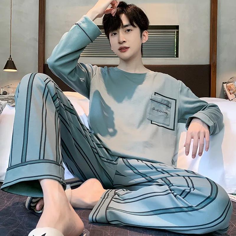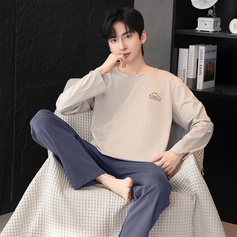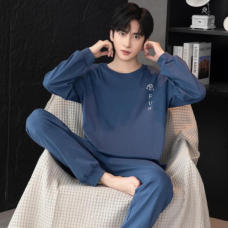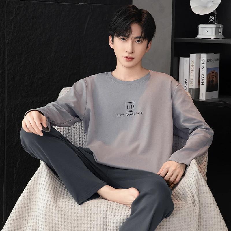 Пижамный комплект для дома, мужской весенний молодежный комплект с длинным рукавом, свободный, простой, повседневный, комплект для дома, плюс пижама для полных мальчиков