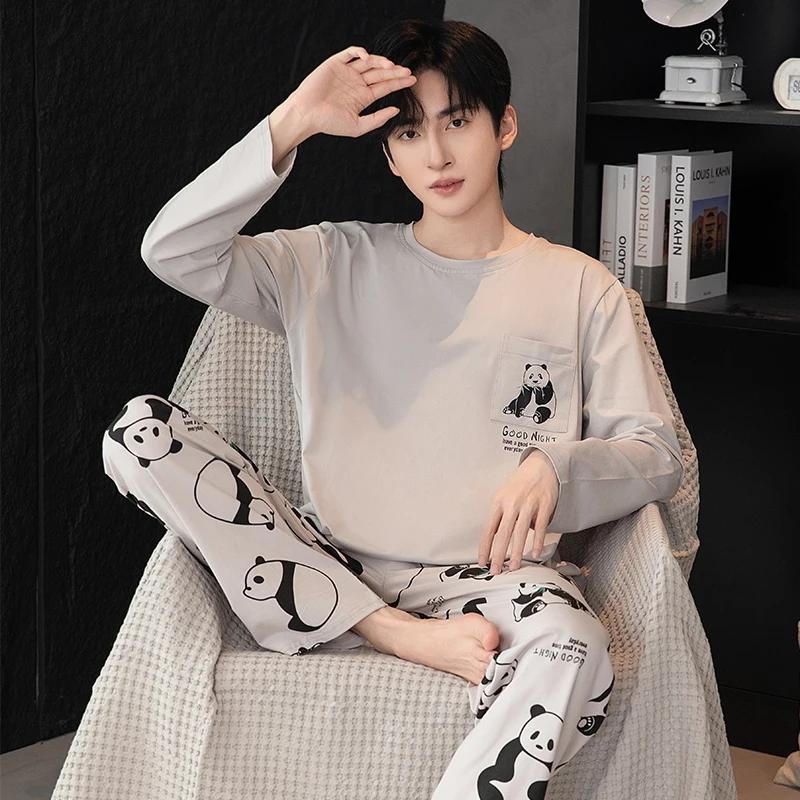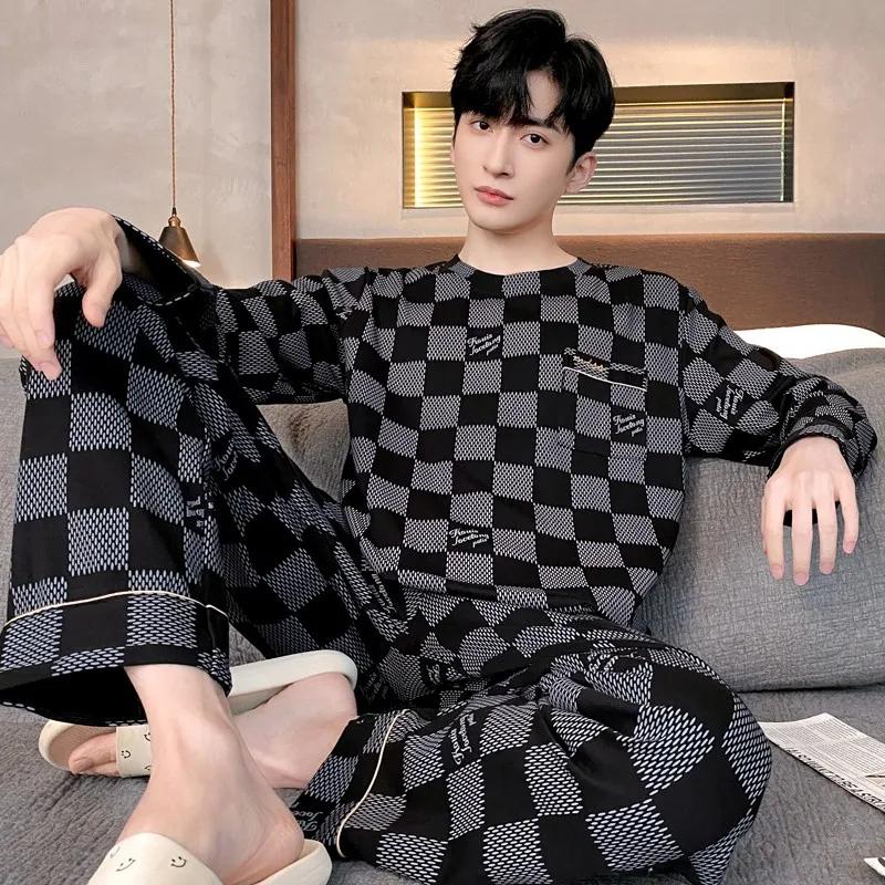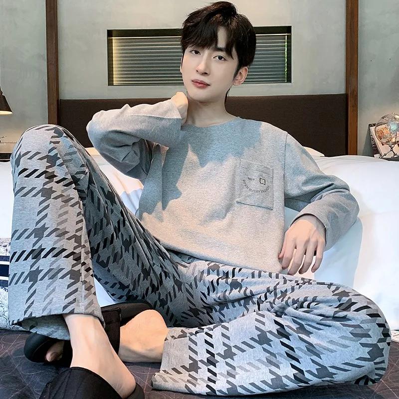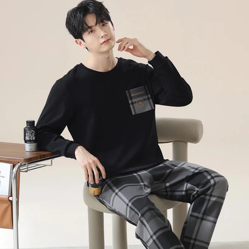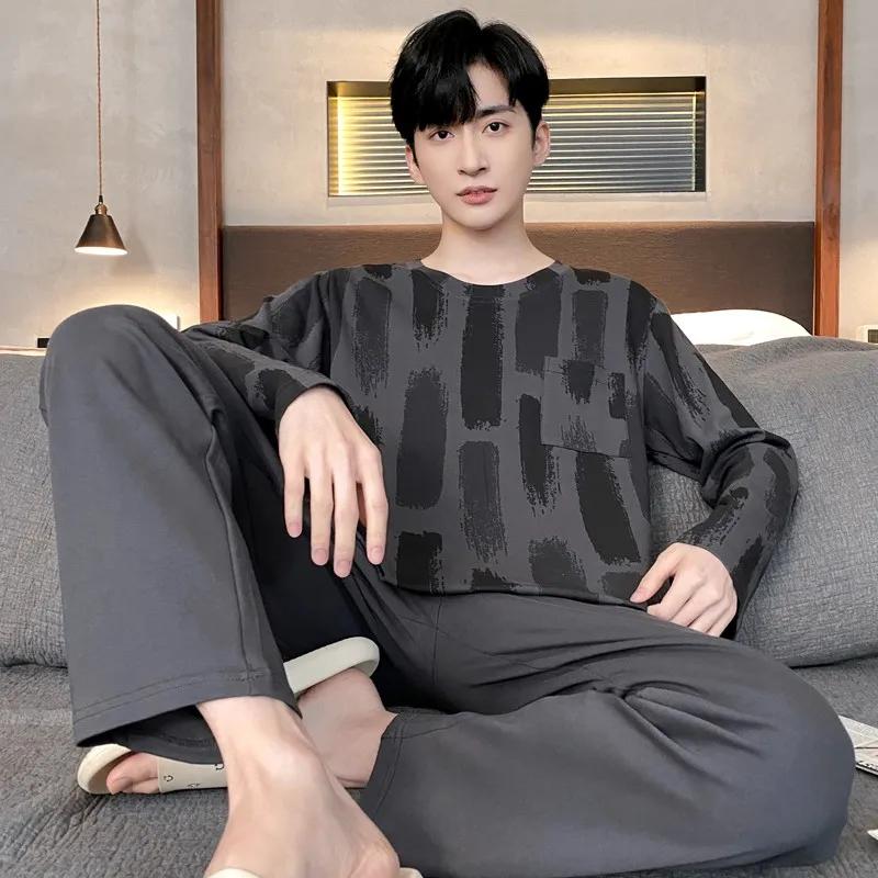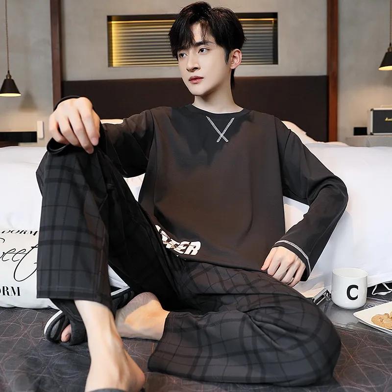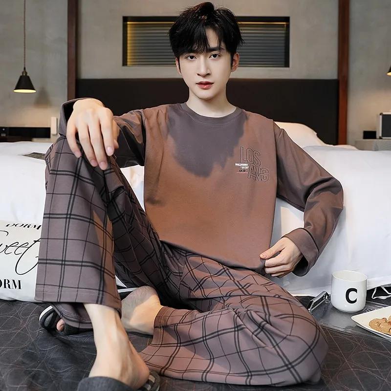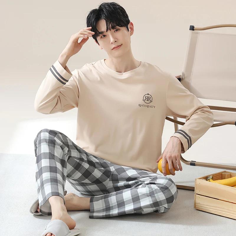Пижамный комплект для дома, мужской весенний молодежный комплект с длинным рукавом, свободный, простой, повседневный, комплект для дома, плюс пижама для полных мальчиков
