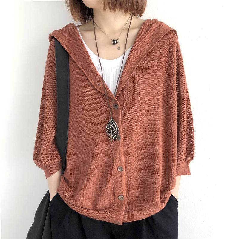 Женский весенне-летний однотонный свободный тонкий свитер с большим капюшоном и рукавами 3/4, вязаное пальто-кардиган на пуговицах