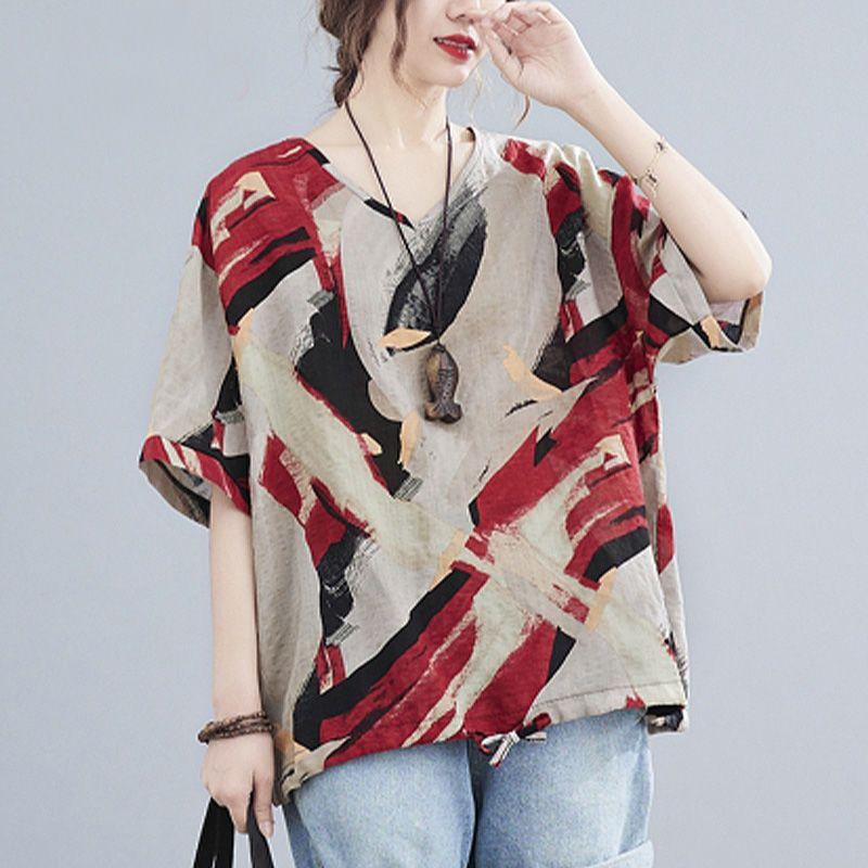 Футболка большого размера из хлопка и льна с короткими рукавами для женщин, летняя, свободная, с абстрактным принтом в западном стиле, уменьшающая возраст льняная футболка — купить товар онлайн с бесплатной доставкой до всему миру!