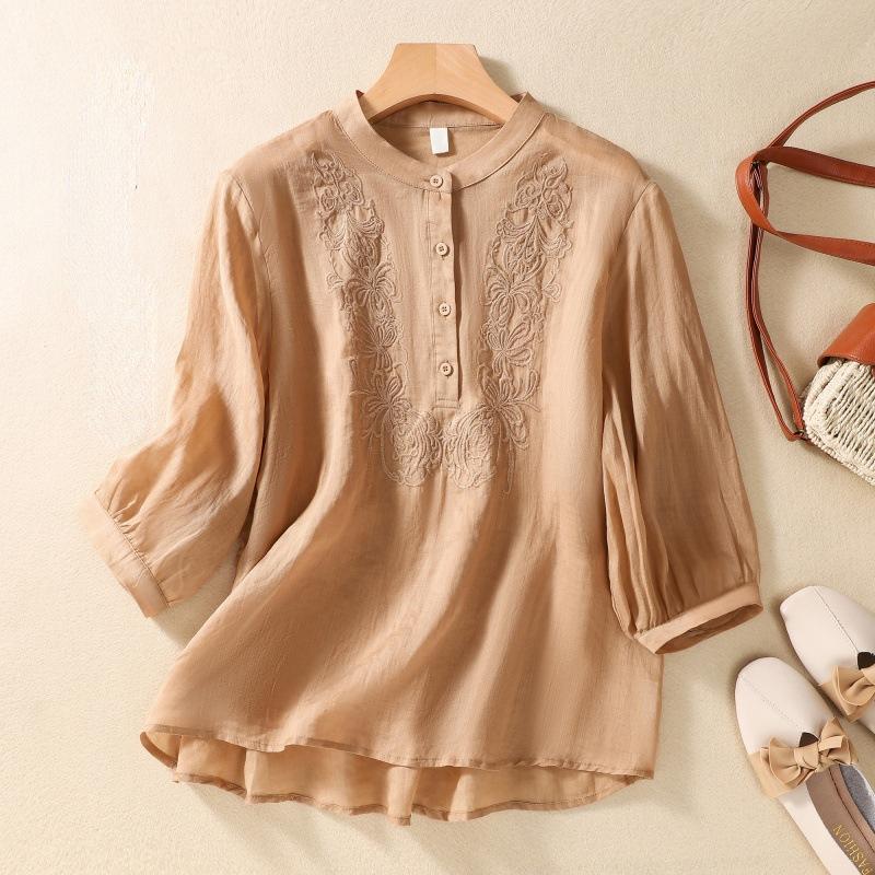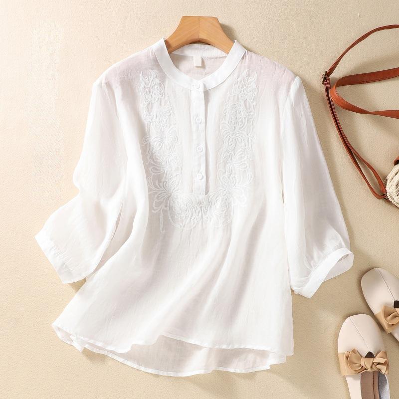 Летний топ для женщин, хлопково-льняная блузка с вышивкой в стиле ретро, рубашка со стоячим воротником и половиной рукава