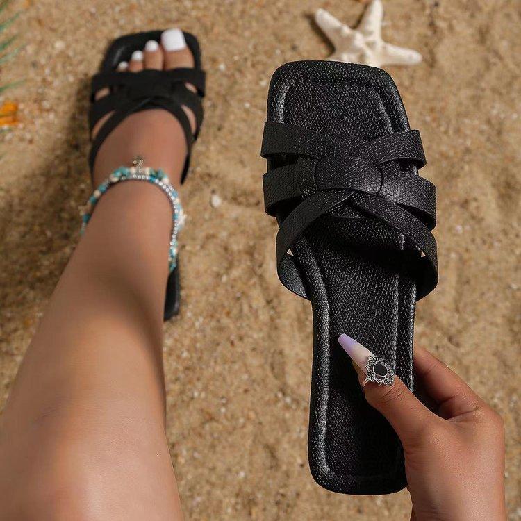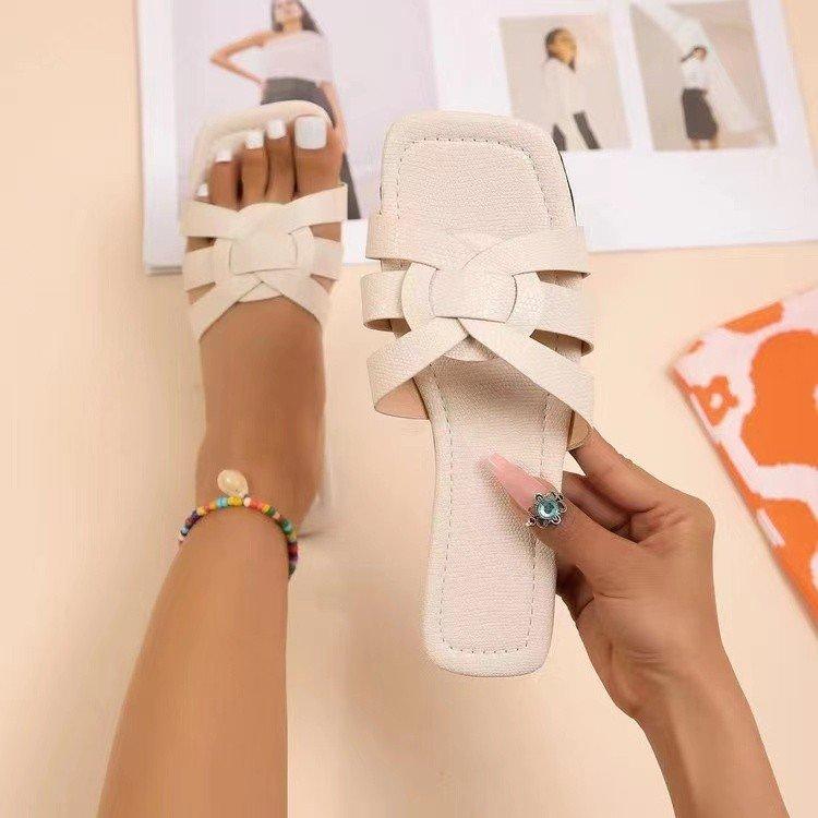 Женские сандалии с перекрестными ремешками, однотонные сандалии слипоны на плоской подошве с квадратным носком, удобная обувь для повседневной носки и улицы