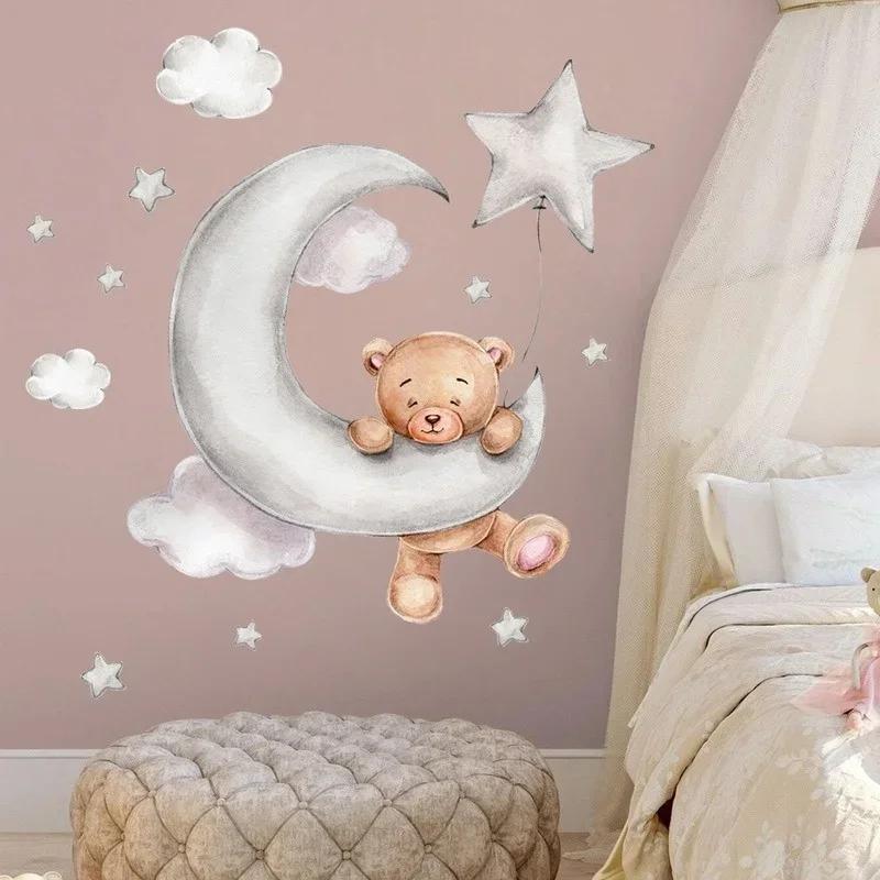 Луна, облака, большие настенные наклейки для детских комнат, мальчики, звезды, большие настенные наклейки для детских комнат, украшение для спальни с медведем